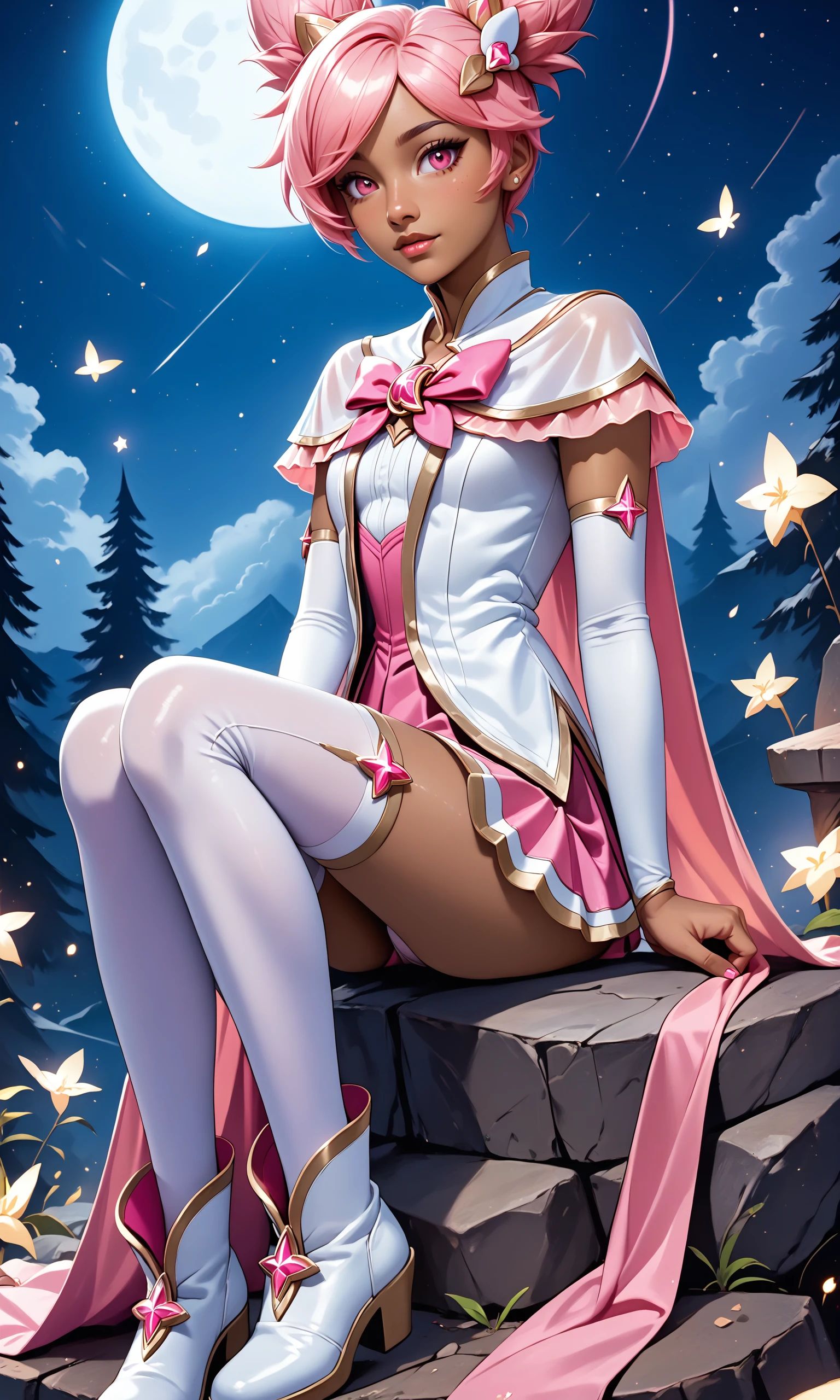 score_9, score_8_up, score_7_up, (solo, 1girl), (absurdres, ,highres), (masterpiece, best quality), (perfect details, highest detailed, extreme detailed),<lora:SGTaliyahSDXL-000040:0.9>, star guardian taliyah, thighhighs , pink skirt, arm sleeve, twin buns, pink eyes, hair ornament, pink bow, dark-skinned female, boots, one arm against the hip