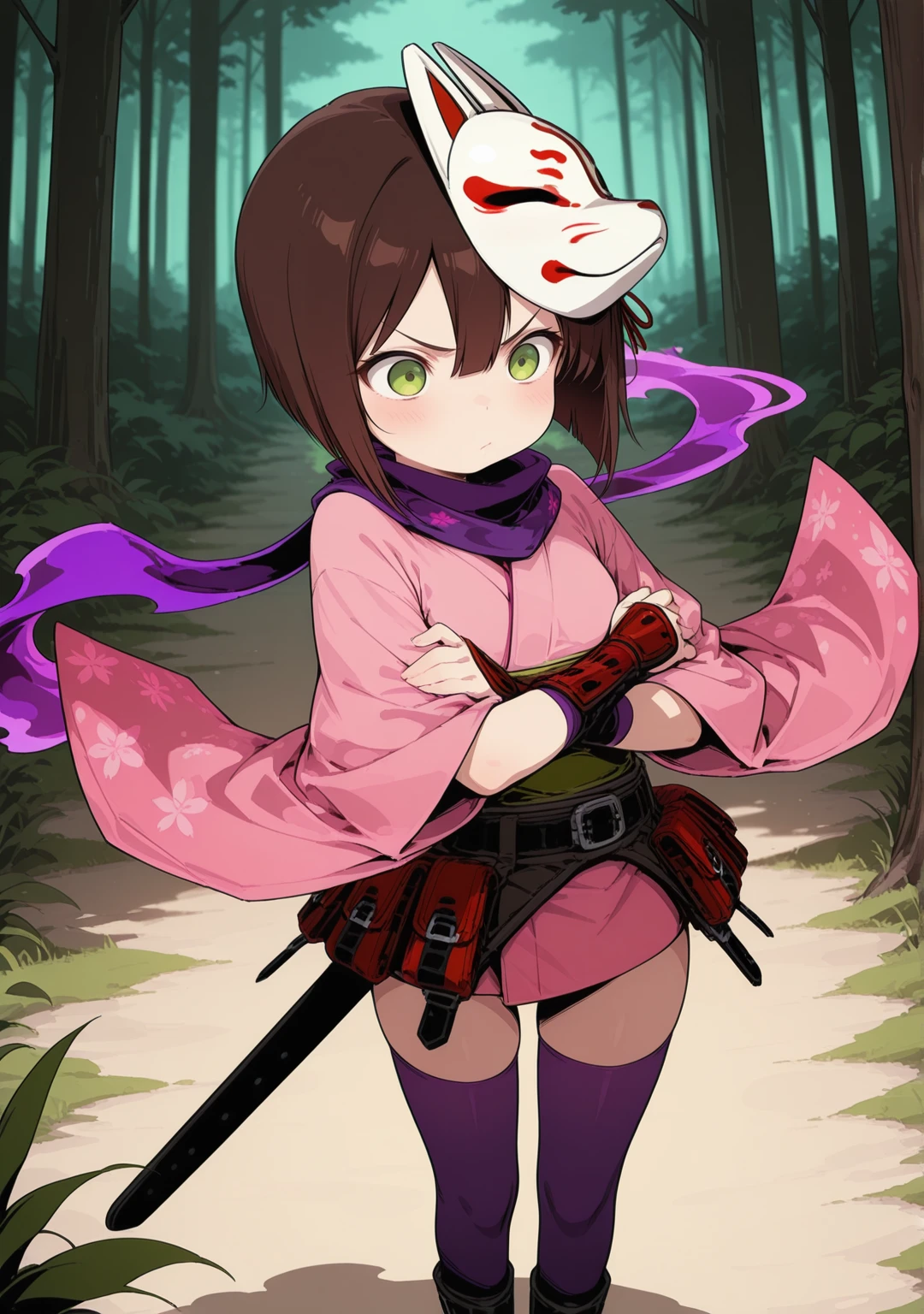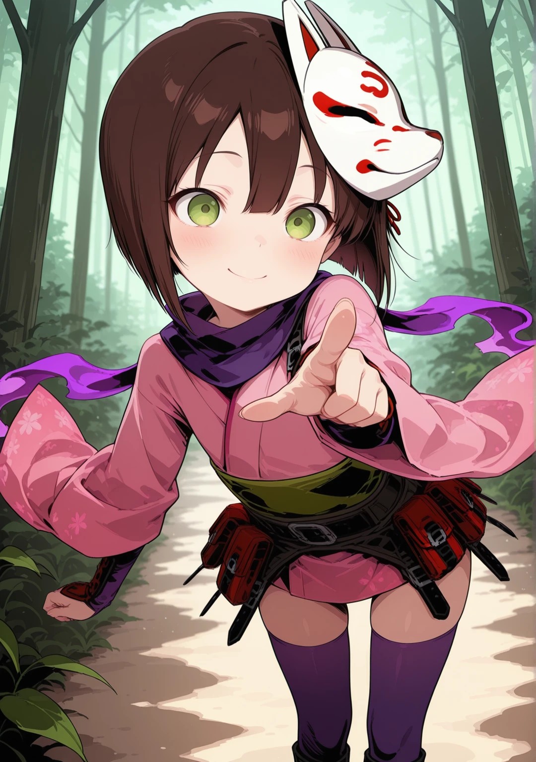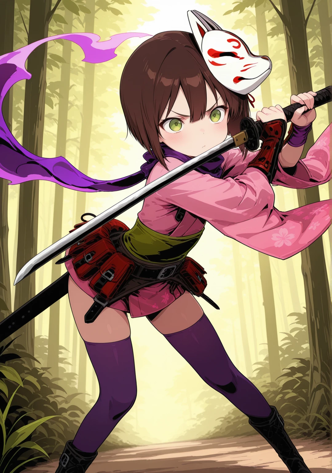 recommend:brown hair,green eyes,short hair,bob cut,belt,fox mask,japanese clothes,kote,mask on head,pink kimono,wide sleeves,floral print,purple thighhighs,black footwear,boots,purple scarf,short kimono,zettai ryouiki,