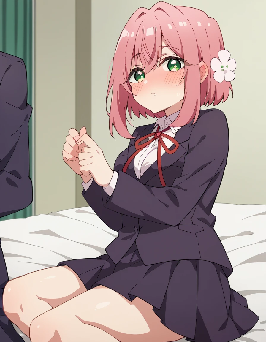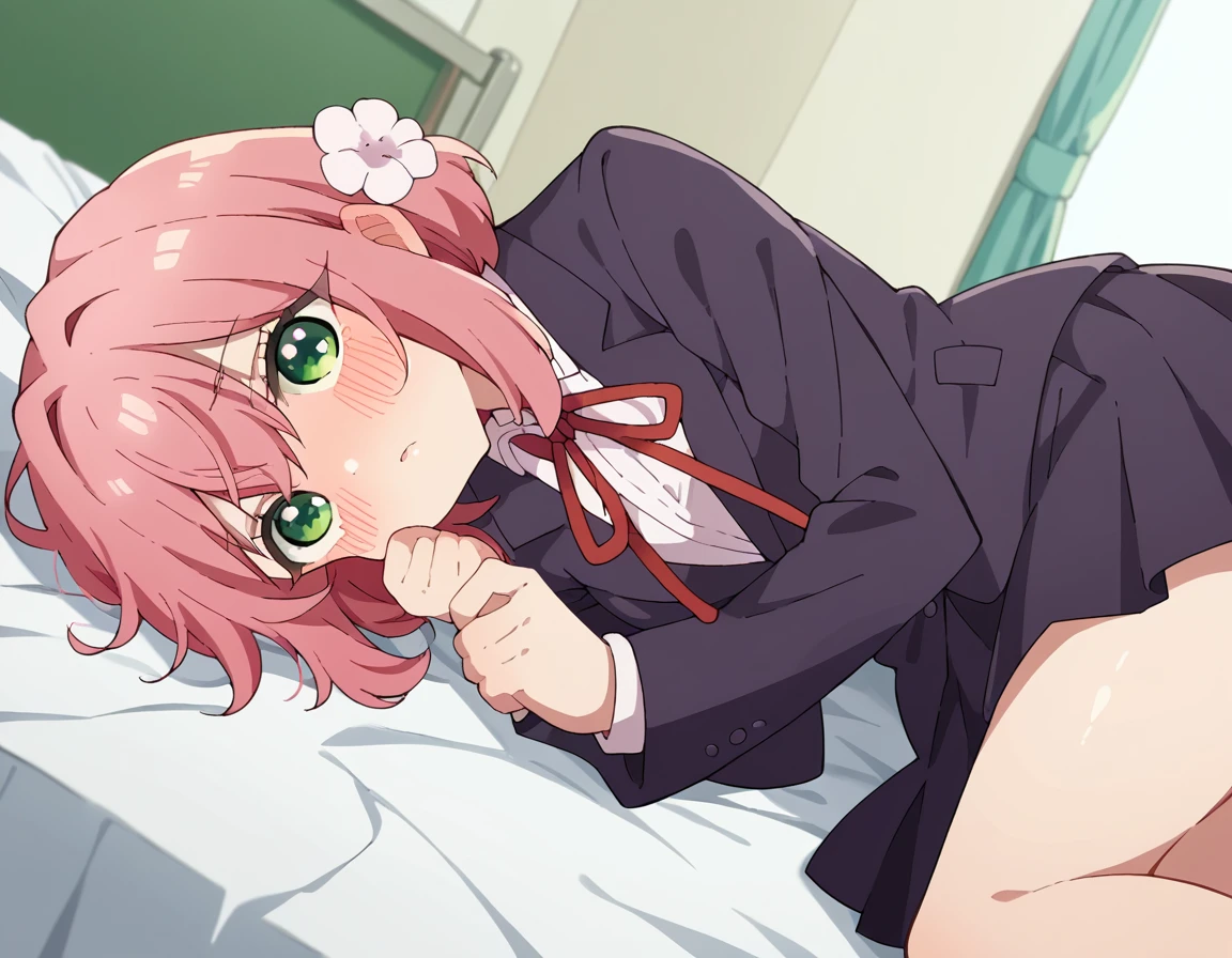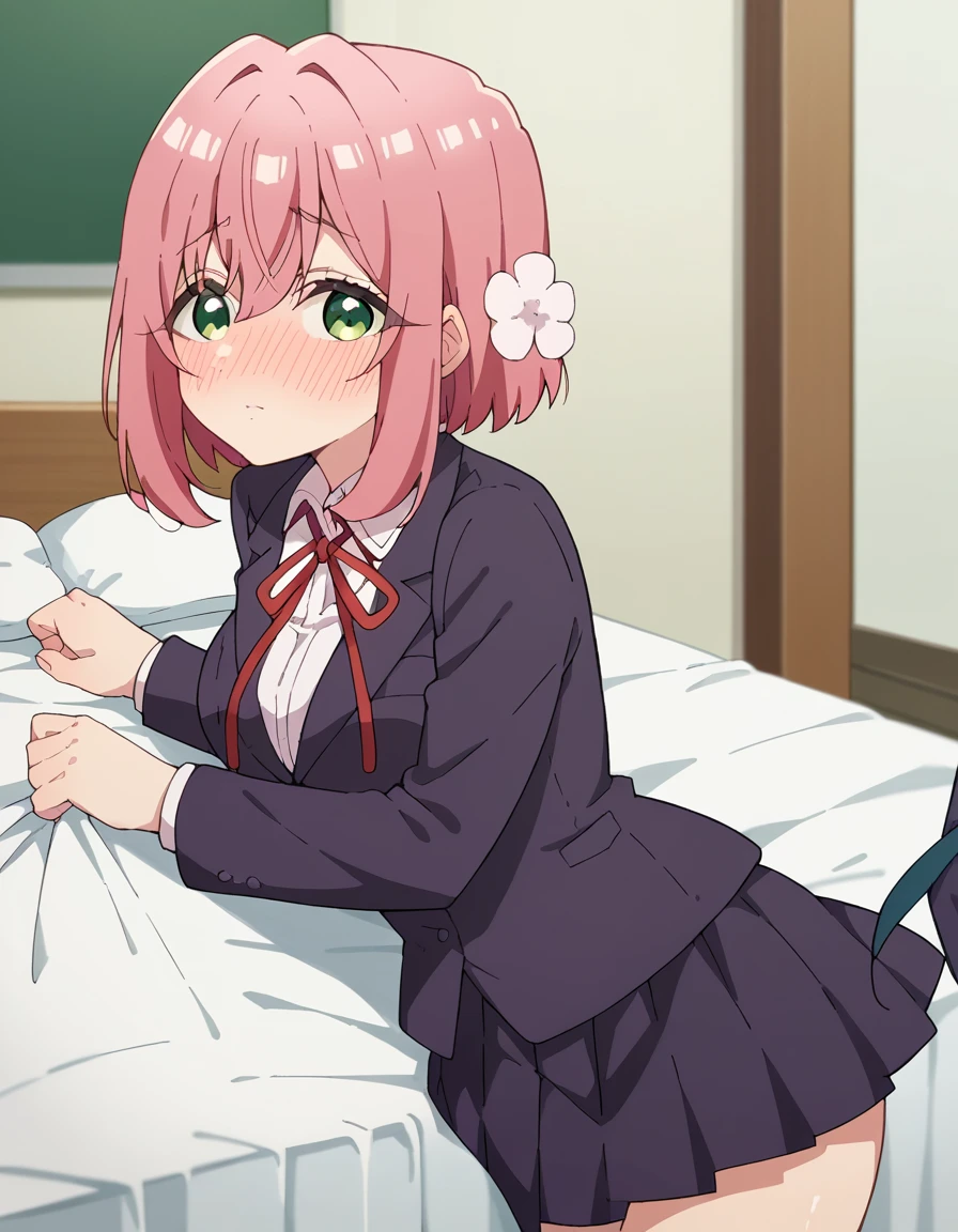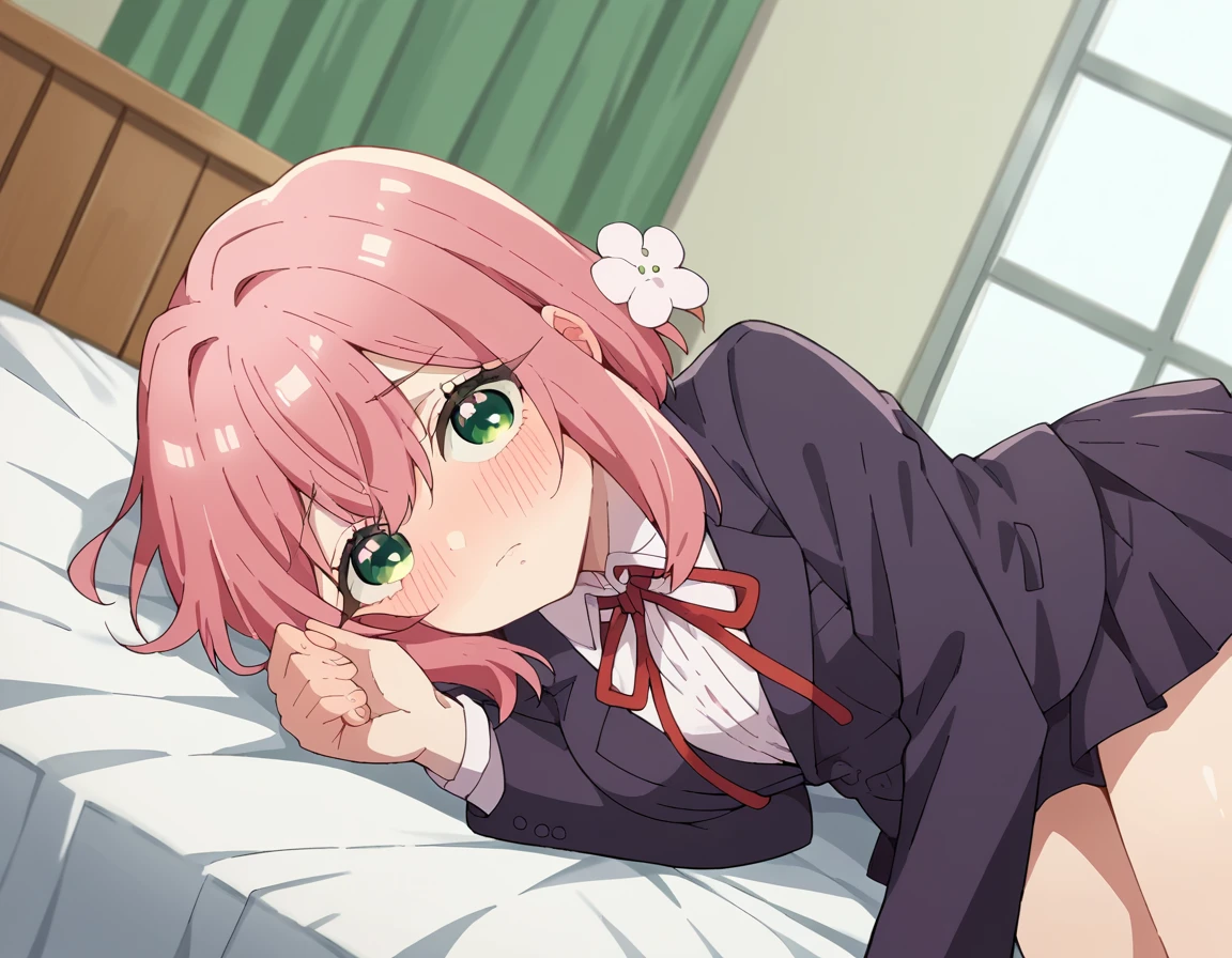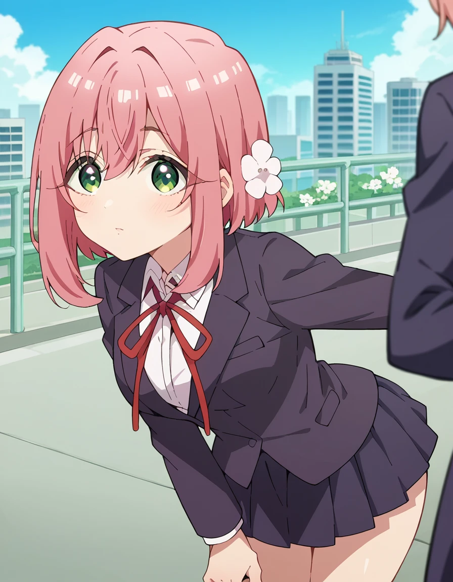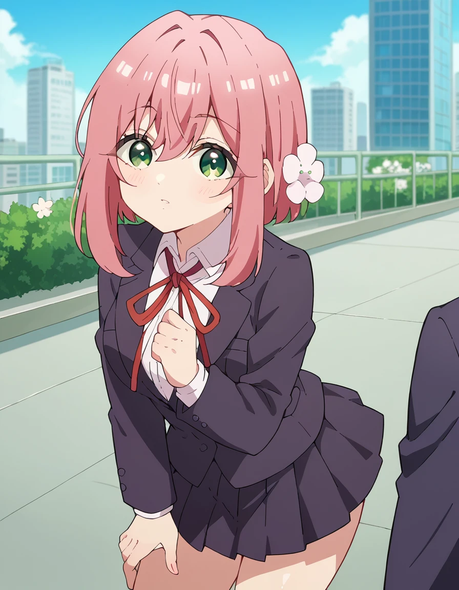 hakari hanazono, short hair, hair ornament, green eyes, pink hair, flower, hair flower, hair between eyes, sidelocks,