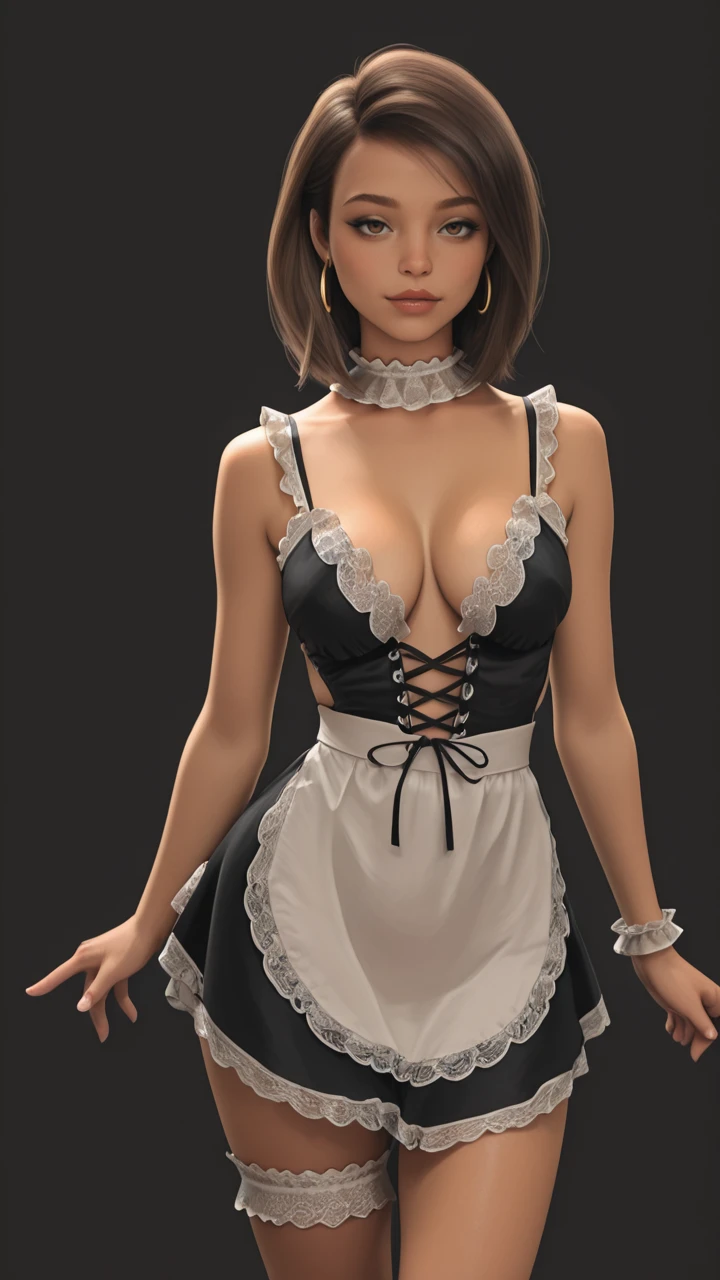french maid, lingerie, plunge neckline, cleavage, laced bust, white lace trim, midriff, short apron, short dress, white lace collar, white lace wrist cuff, white lace garter, gold hoop earrings, large hoop