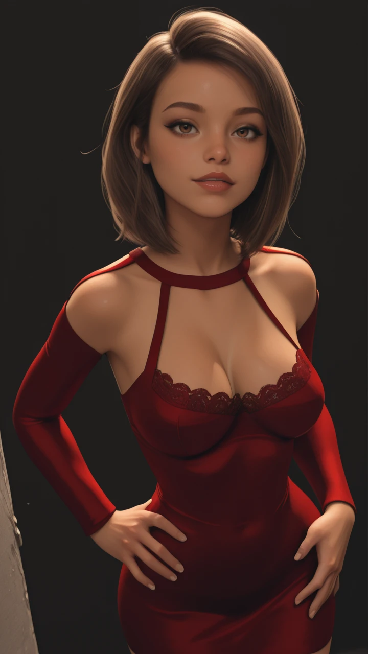 evening dress, red dress, collar, cleavage cutout, cleavage, lace trim, shoulder cutout, long sleeves, short dress, slim-fit