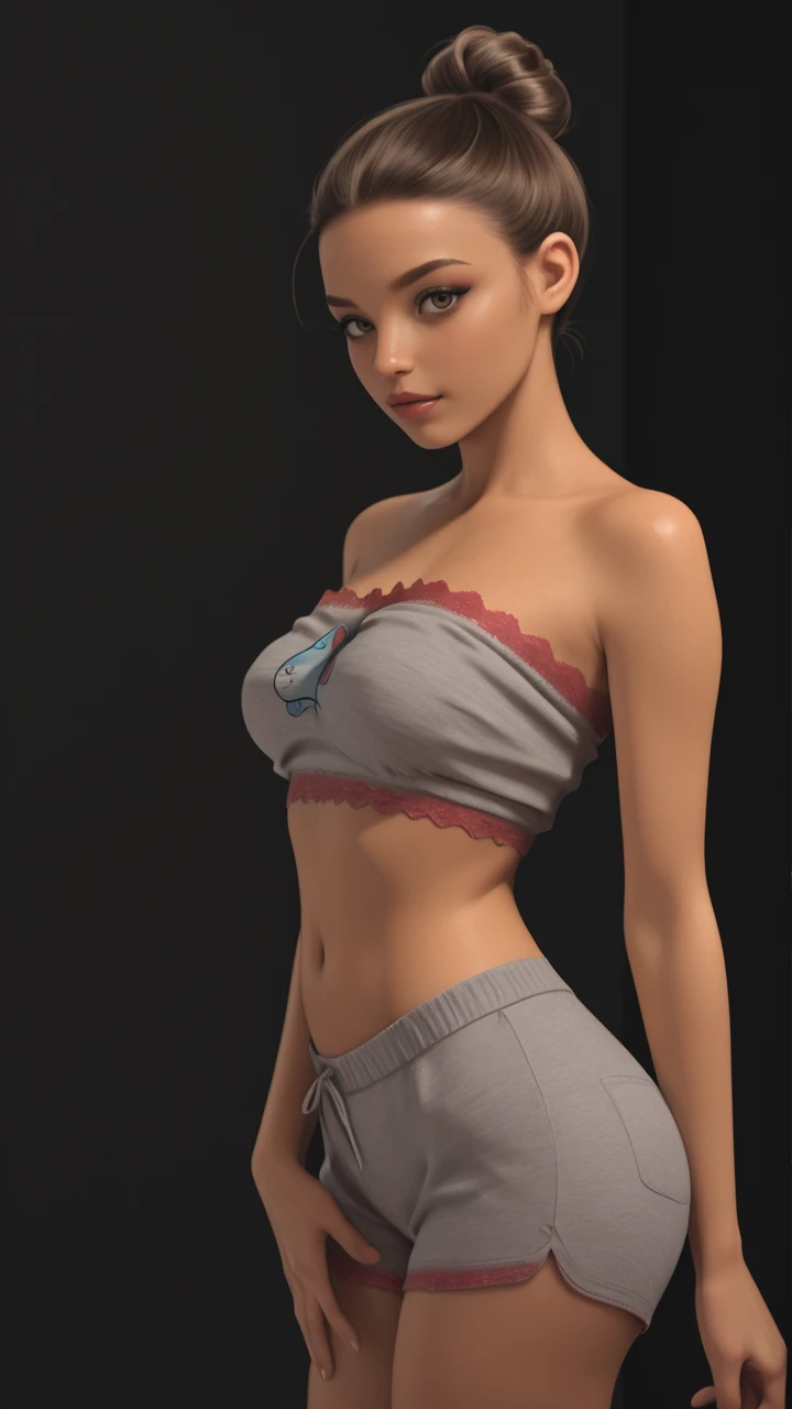 gray pajama top, tube top, pink lace trim, strapless, midriff, cartoon print, gray pajama shorts, string tie, pink lace hem, short shorts