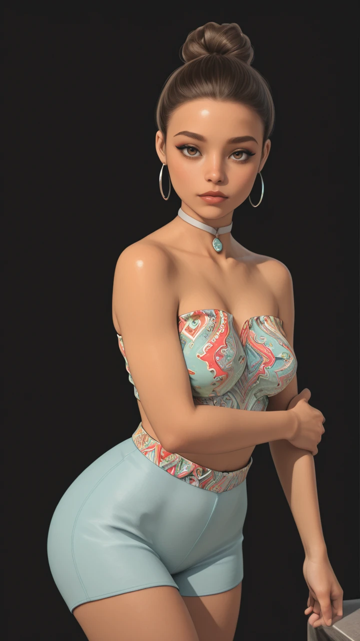 colorful top, tube top, bare shoulders, midriff, sky blue shorts, tight shorts, colorful waistband, white choker, pendant, silver hoop earrings, large hoop