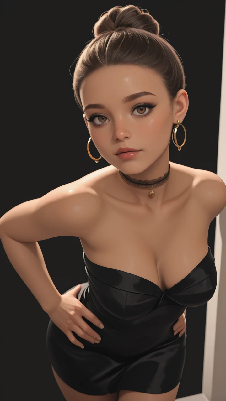 black party dress, strapless, bare shoulders, cleavage, short dress, slim-fit, lace choker, gold necklace, small brooch, gold earrings, double hoop