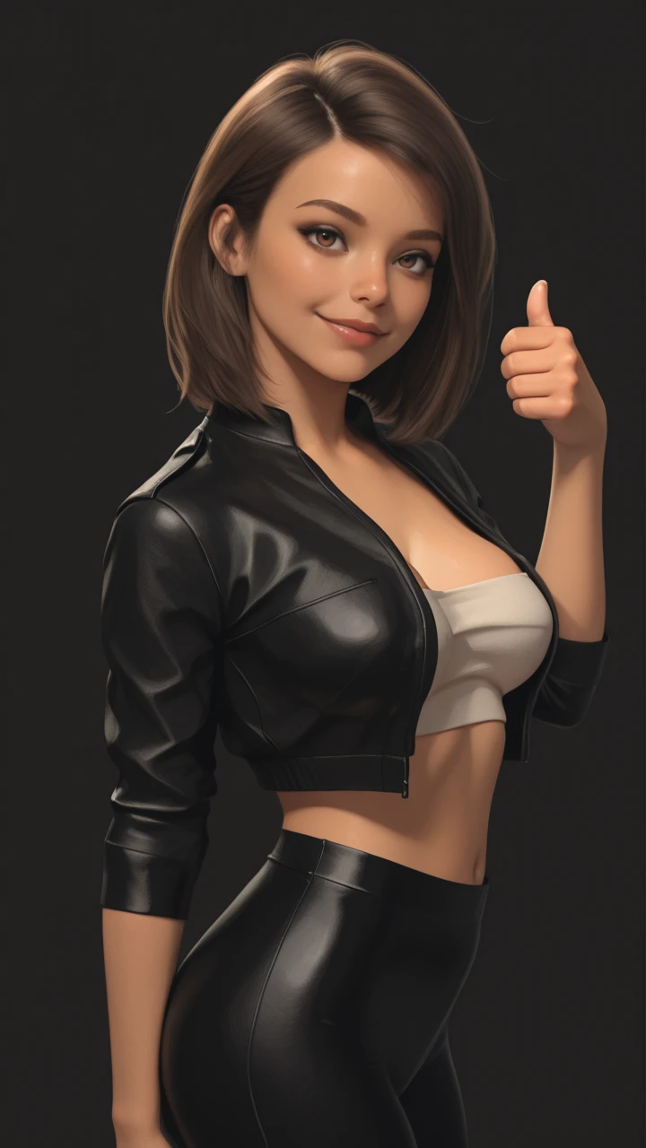 black jacket, short jacket, elbow sleeves, white tube top, cleavage, midriff, black pants, tight pants, leather