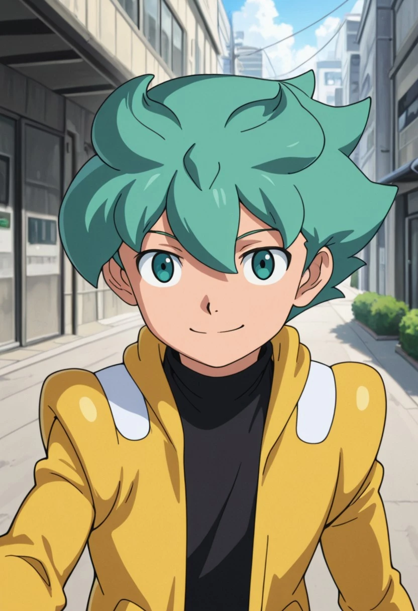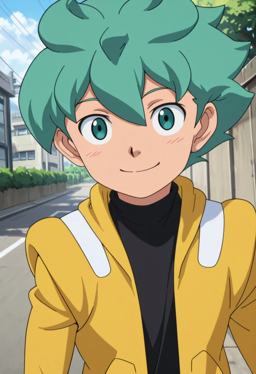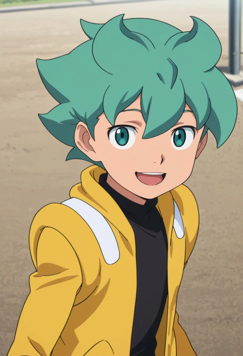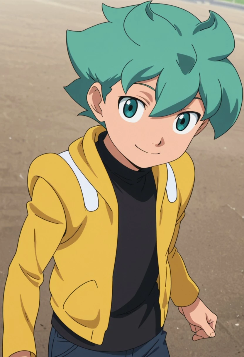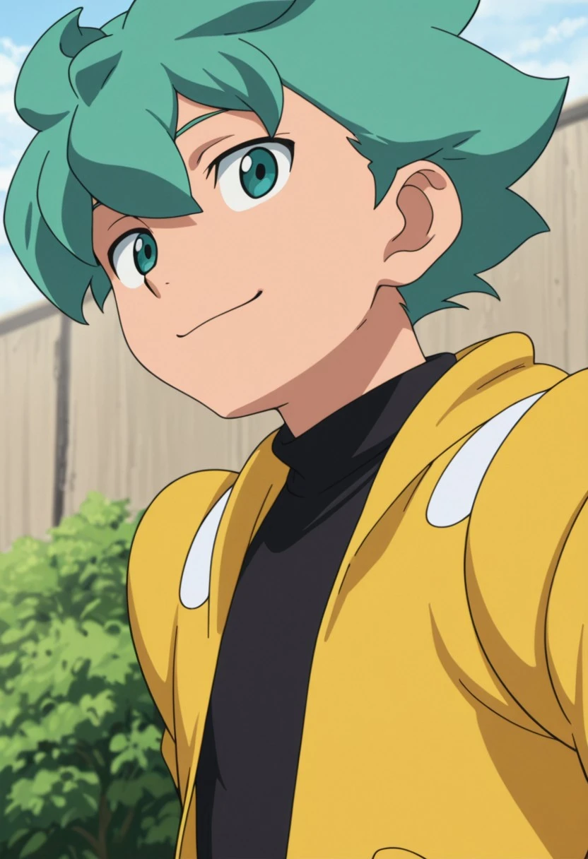 flitasuno, 1boy, male focus, solo, green eyes, green hair, black shirt, yellow jacket, open jacket, white shorts, shoes, white footwear,