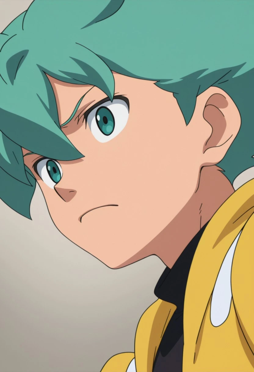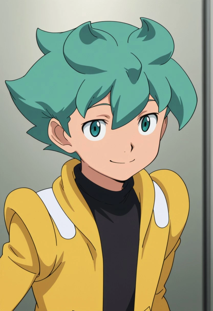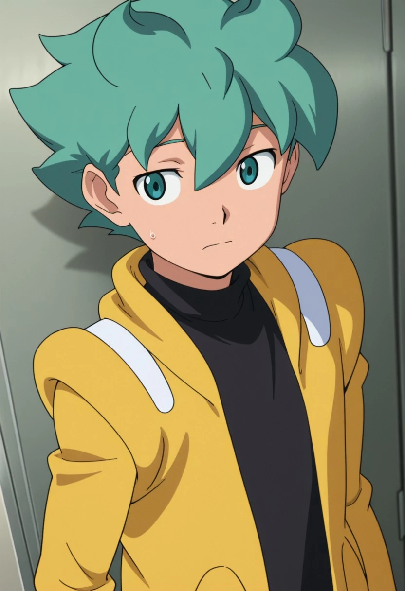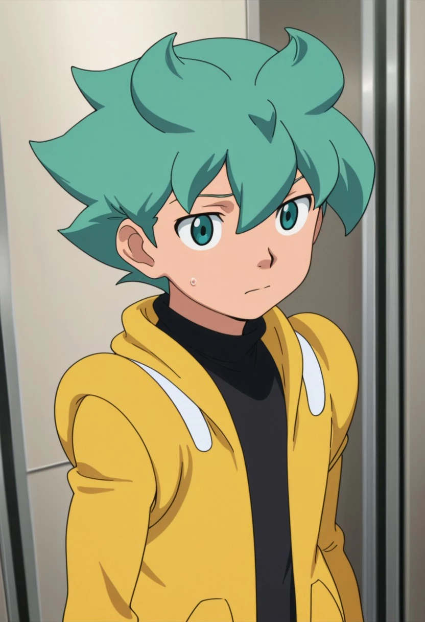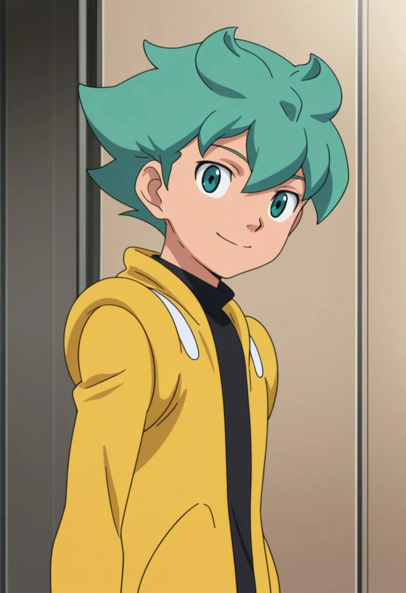 flitasuno, 1boy, male focus, solo, green eyes, green hair, black shirt, yellow jacket, open jacket, white shorts, shoes, white footwear,