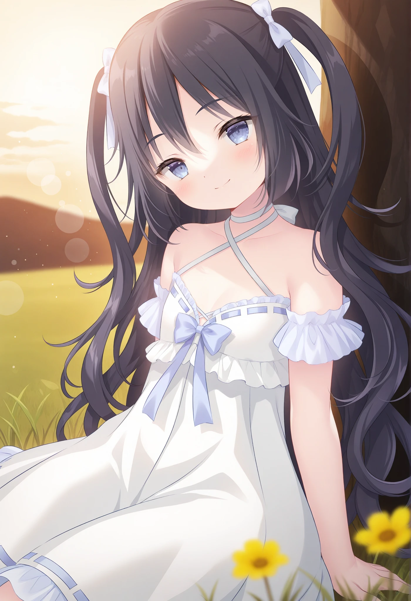 wavy hair,two side up,hair bow,white dress,criss-cross halter,halterneck,frilled dress,ribbon-trimmed dress,detached sleeves,short sleeves,chest bow,————————————