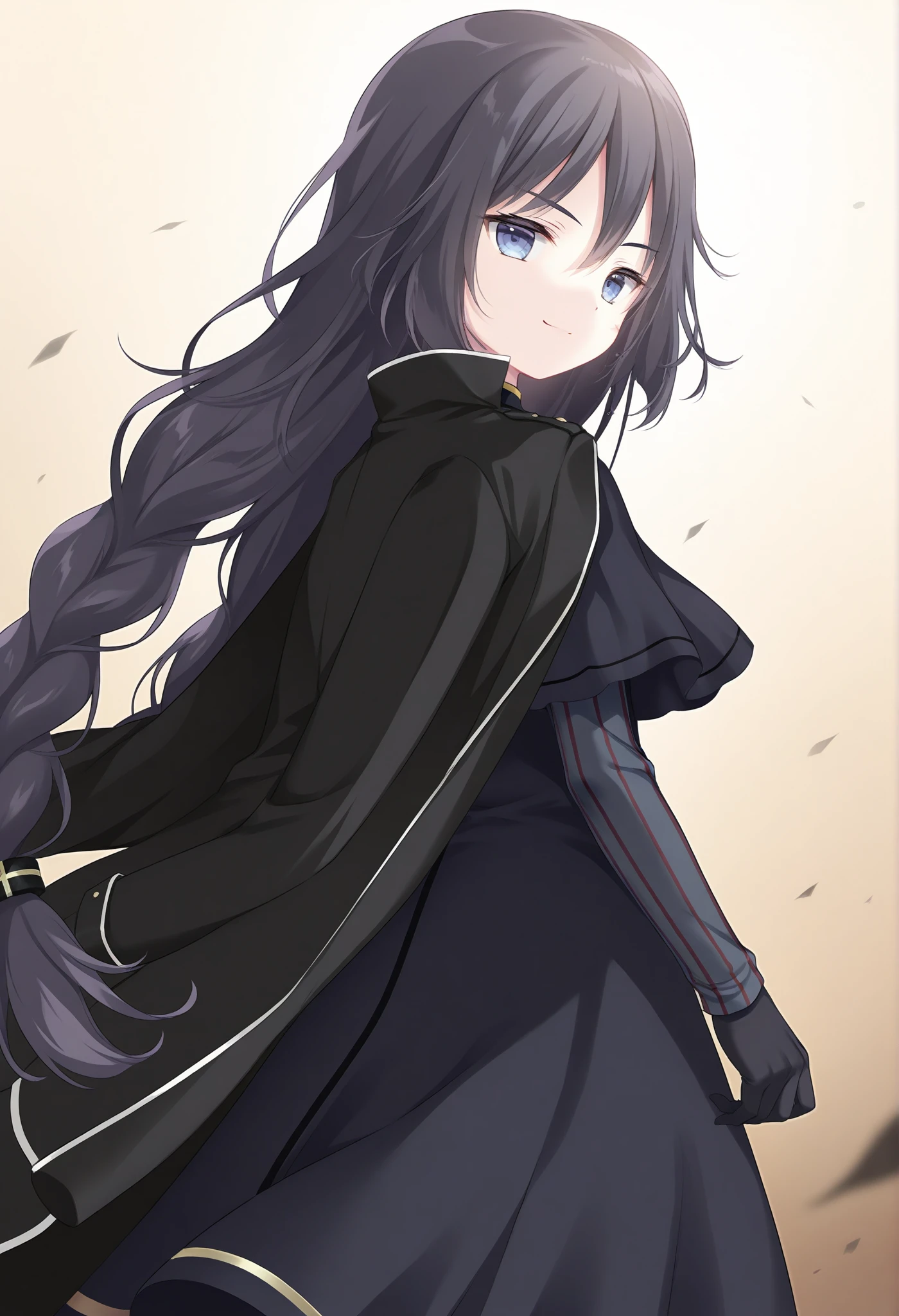 twin braids,low-braided long hair,jacket on shoulders,black jacket,open jacket,long sleeves,striped sleeves,black dress,black capelet,black gloves,白色裙子 (white dress)