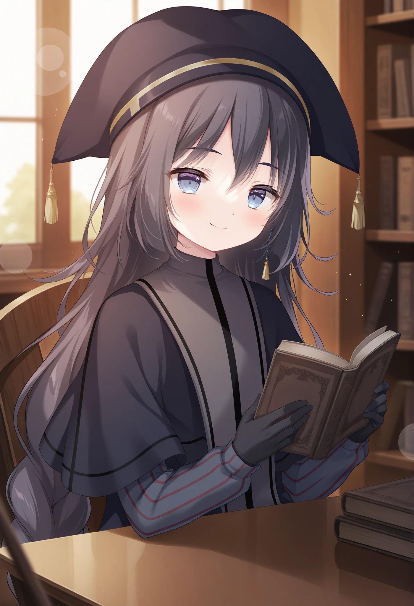 black headwear,mortarboard,twin braids,low-braided long hair,long sleeves,black dress,black capelet,striped sleeves,black gloves,长裙+夹克 (black dress + jacket)