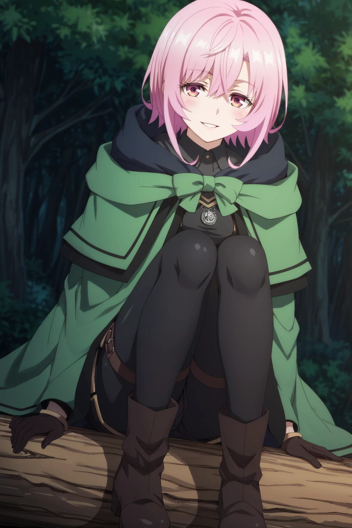 smart_sitri, short_hair, pink_hair, hood, hair_between_eyes, pink_eyes, cloak, green_cloak, gloves, boots