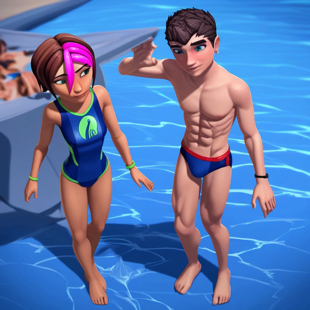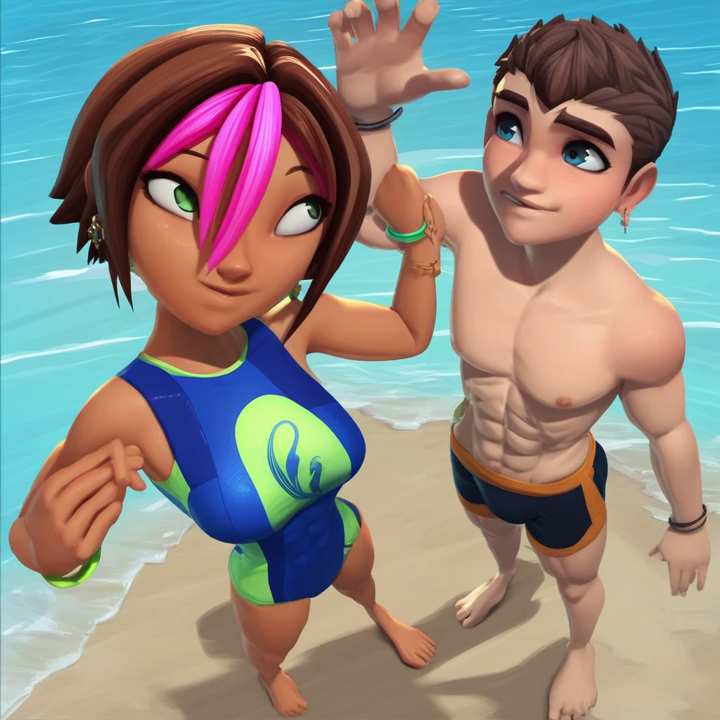 fontaine, brown hair, multicolored hair, short hair, pink hair, green eyes, two-tone hair, hair between eyes, streaked hair,