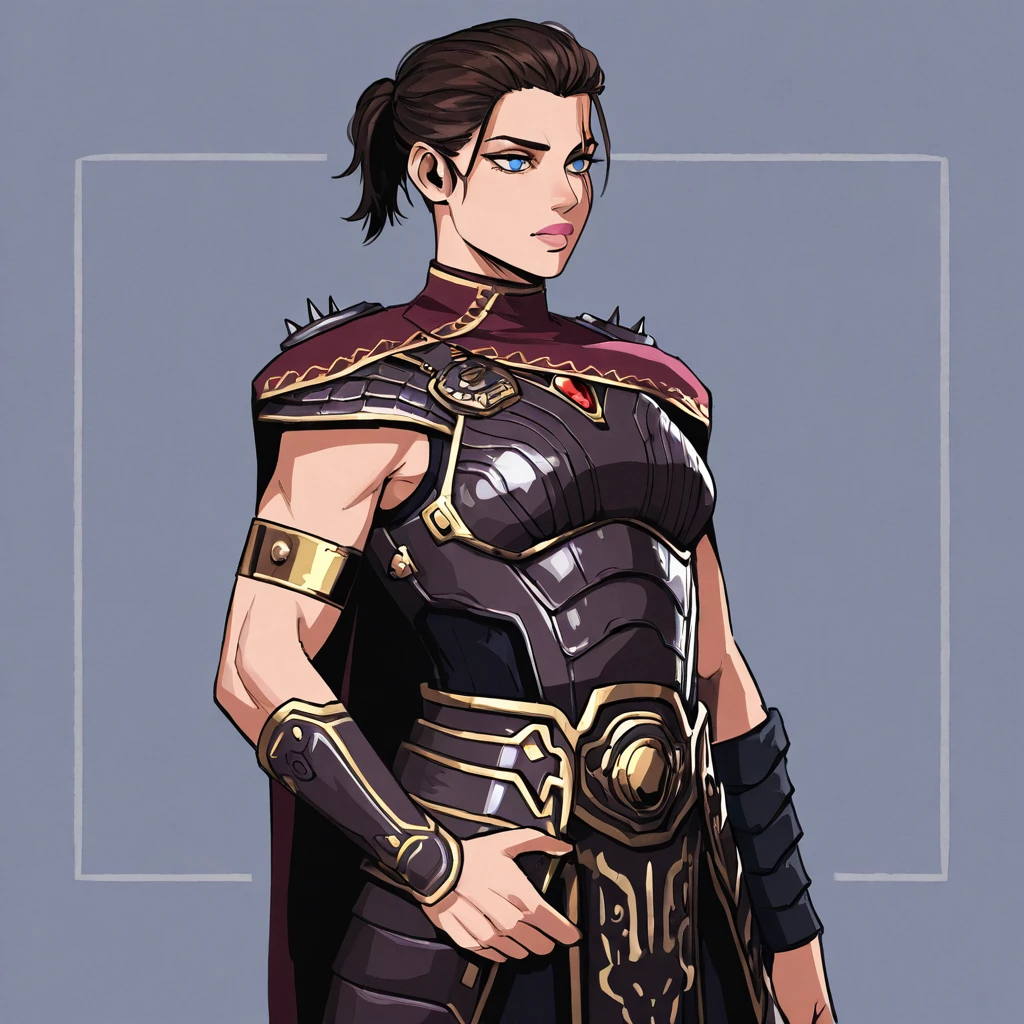 Clothes: armor, breastplate, red gem, spiked pauldrons, single wrist guard, armlet, collared cape