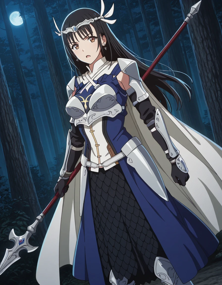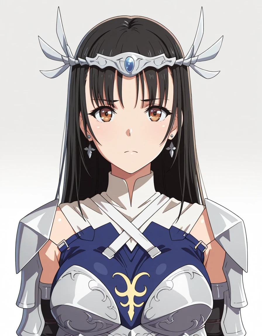 circlet, gem, earrings, high collar, (white cape:0.7), blue dress, armor, shoulder armor, breastplate, elbow gloves, vambraces, overskirt, scales, greaves, armored bootsDescription