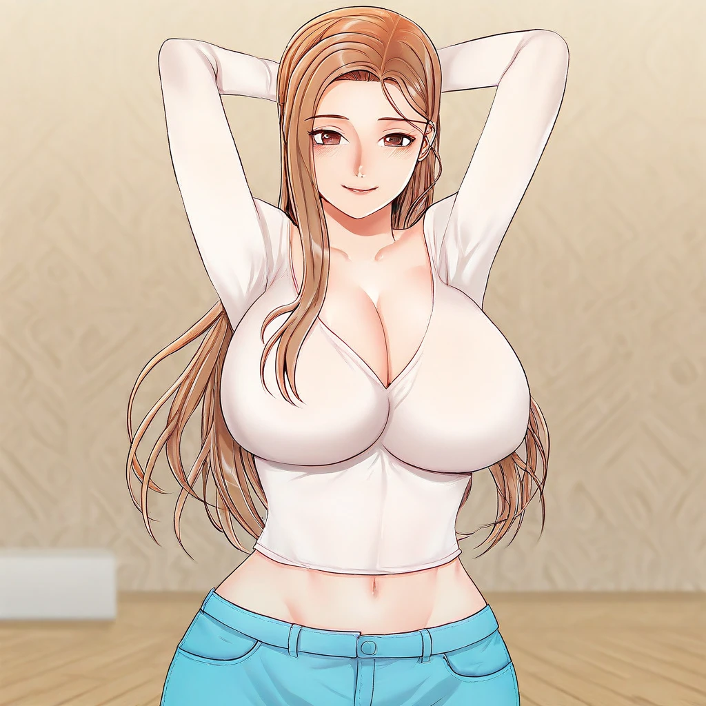 6. ((long-sleeves black collared shirt, obscene cleavage, huge cleavage, denim trousers, ))