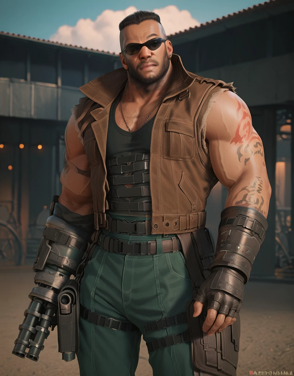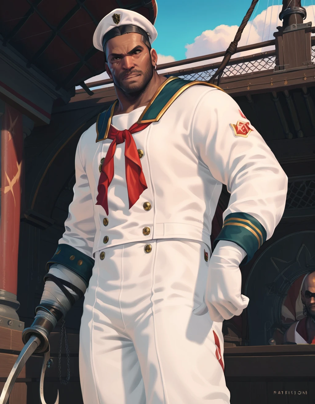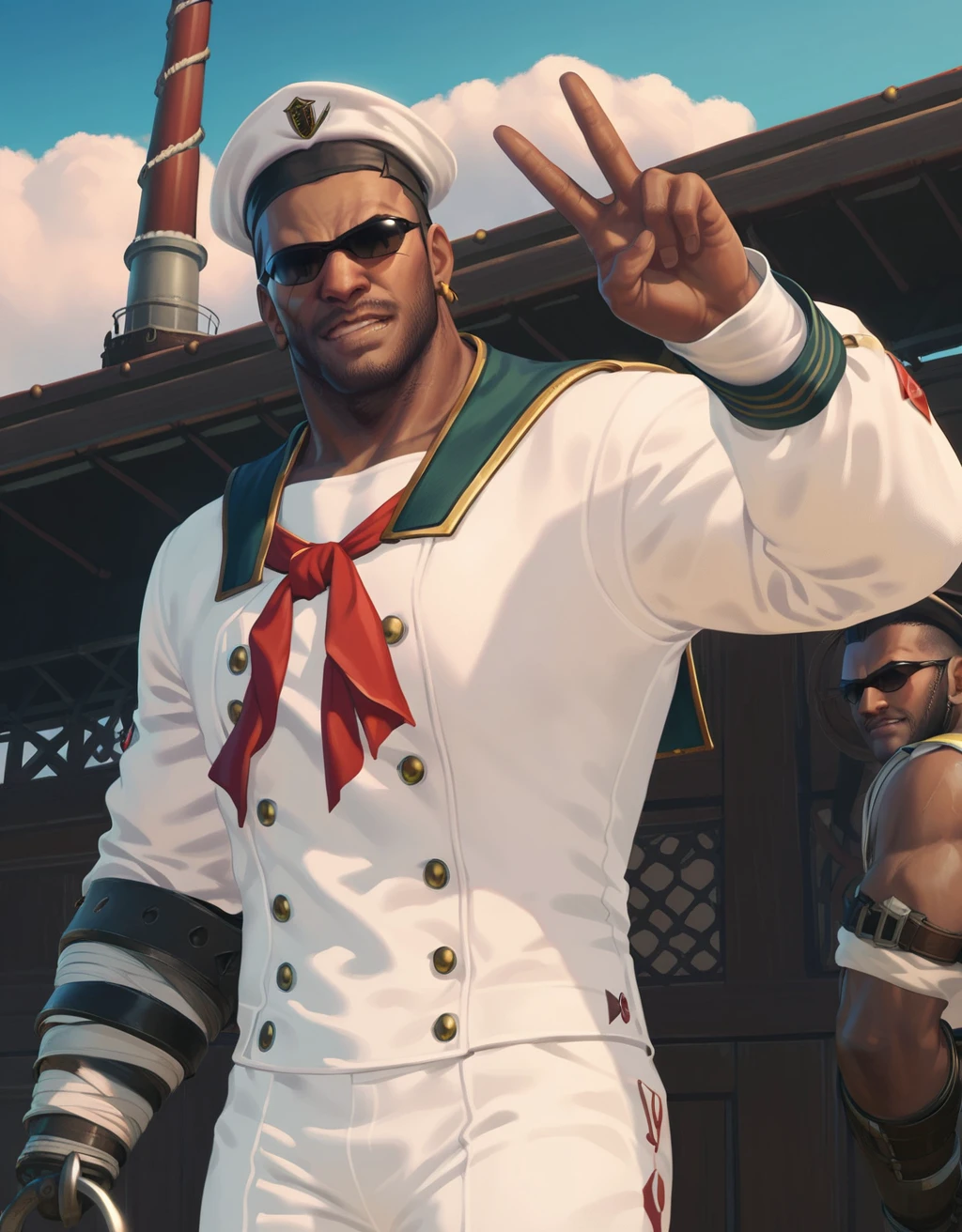 Tags: barret, dark skin male, gun arm, sailor suit, hook for arm, sunglasses