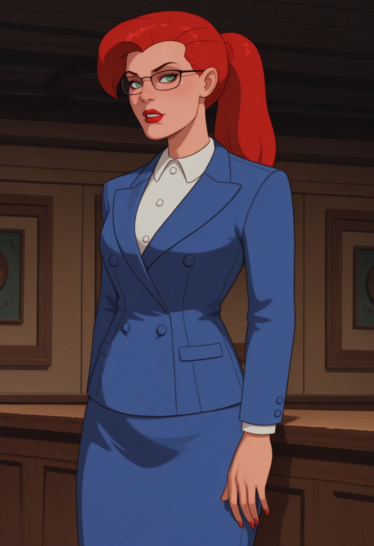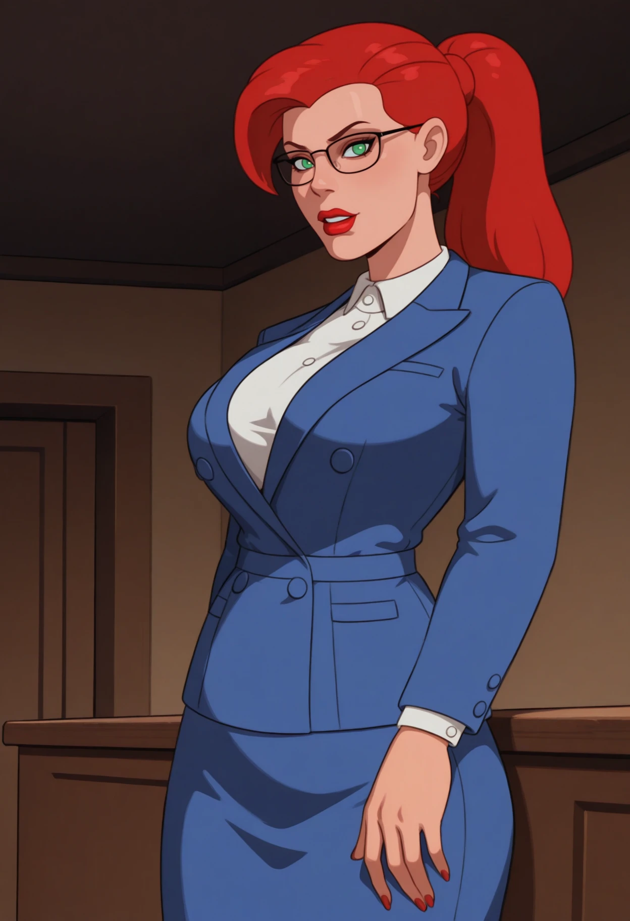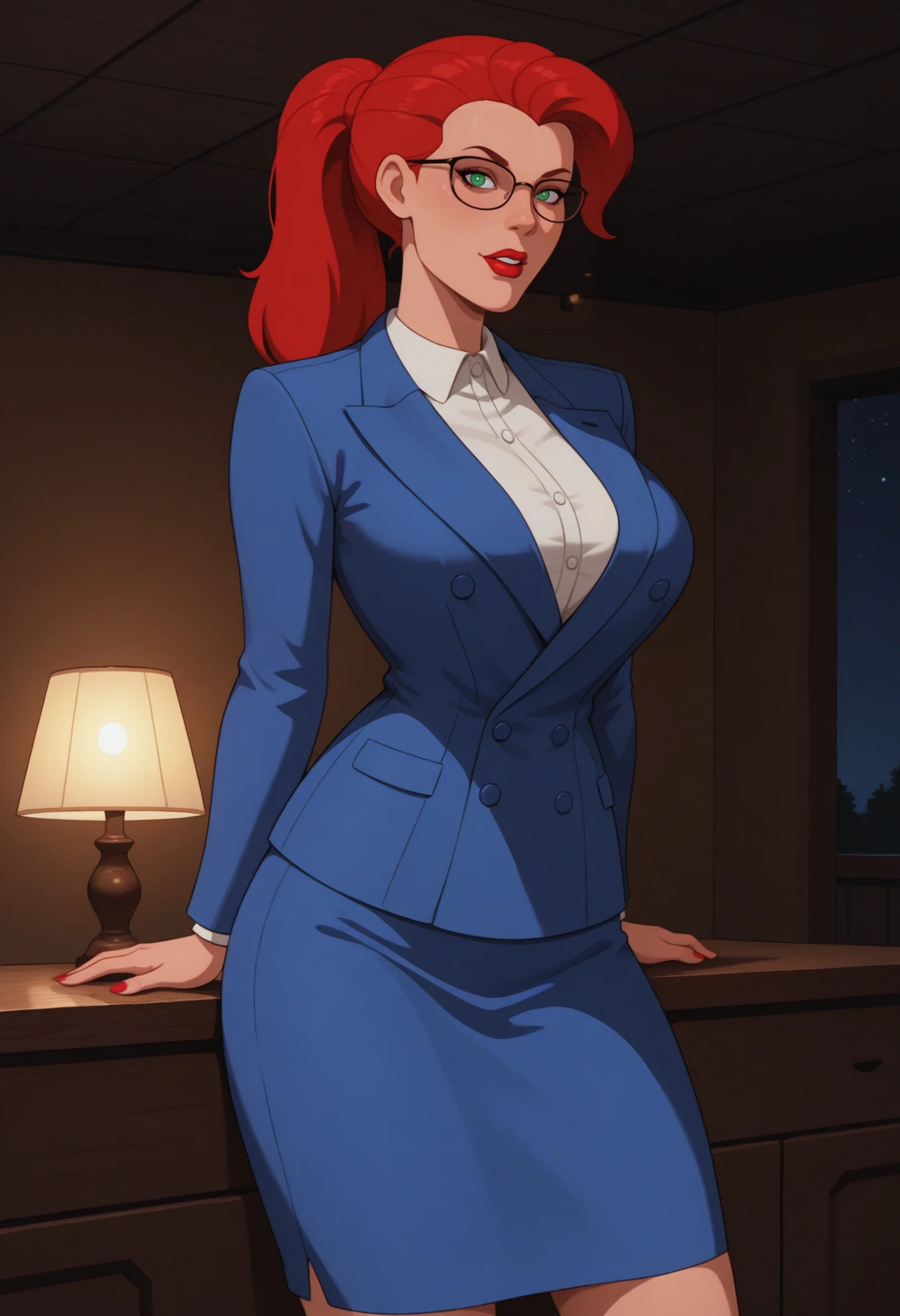 1girl, solo, green eyes, red hair, long hair, ponytail, breasts, large breasts, lipstick, red lips,main outfit: