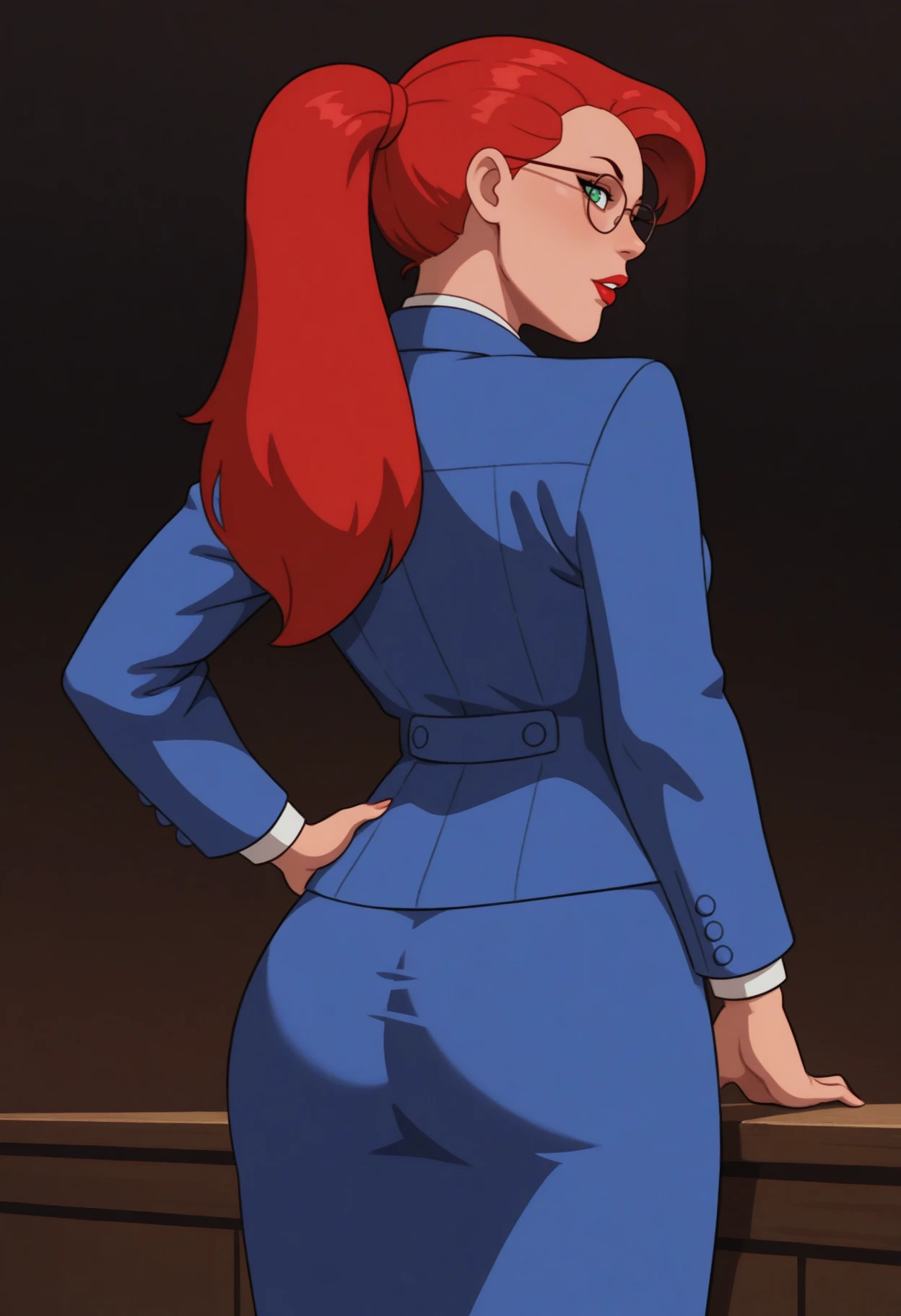 1girl, solo, green eyes, red hair, long hair, ponytail, breasts, large breasts, lipstick, red lips,