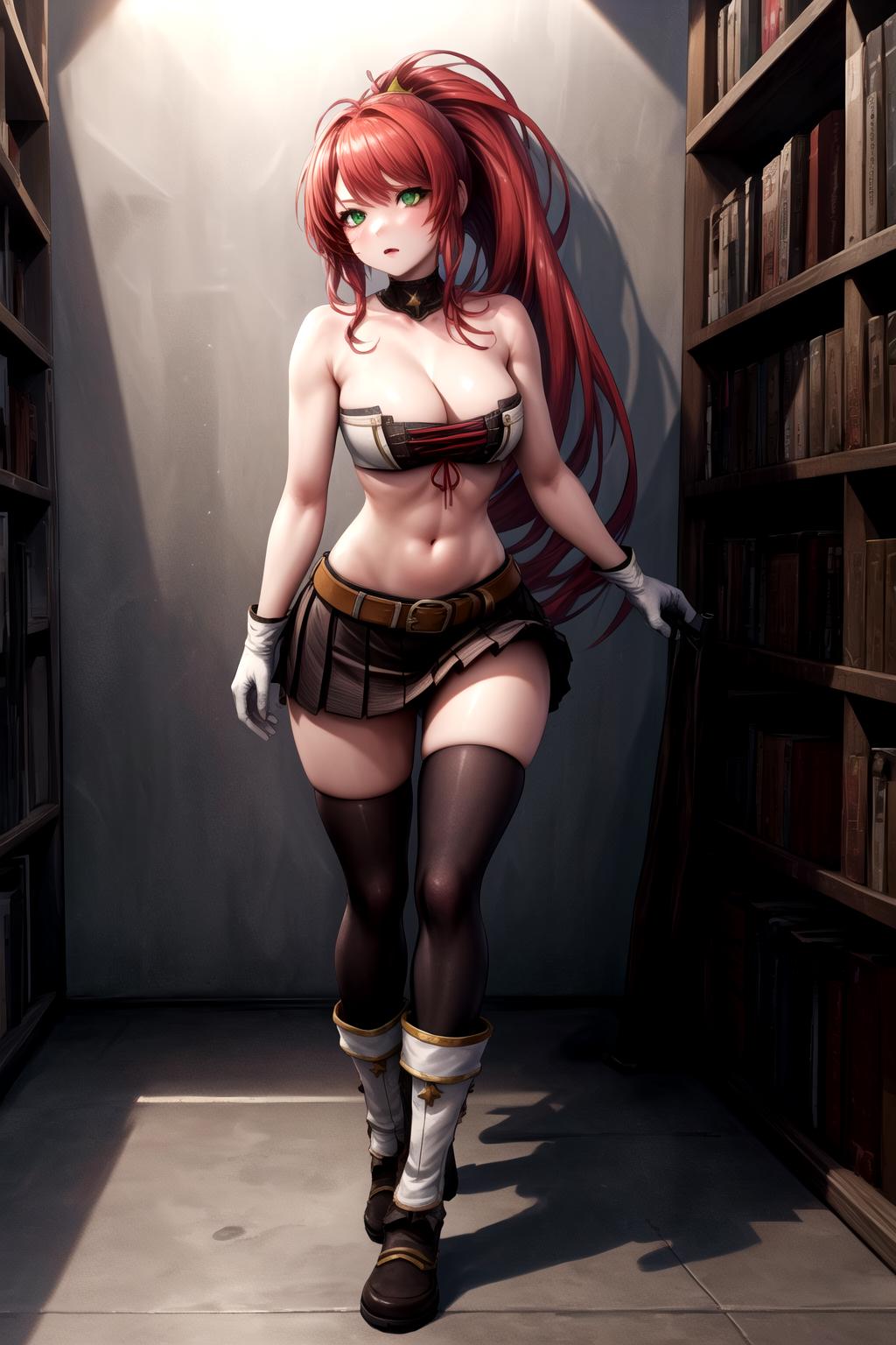 Example Prompt: 1girl, mature female, solo, sitting, full body, red hair, ponytail, long hair, tight (white gloves) with gold trim, green eyes, cleavage, (white tube top) with white sides, strapless, white boots with gold trim, black thighhighs with white (stars), bare shoulders, belt, midriff, bare arms, sleeveless, pleated skirt, tight clothes,<lora:StS-Emma-CravingQuest:0.6>, <lora:more_details:0.4> ALSO I recommend putting elbow gloves , detached sleeves , and jacket in the negative prompt.