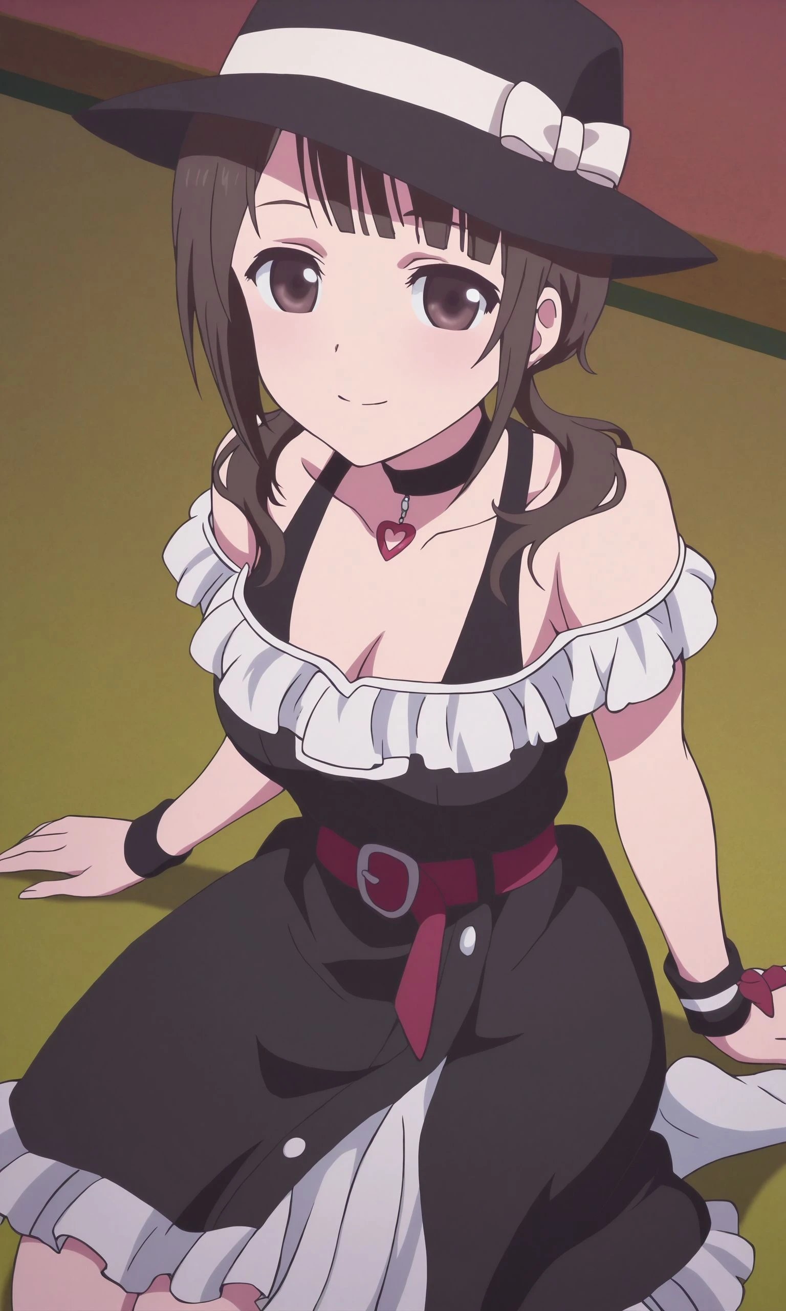 hat, choker, bare shoulders,black choker,off-shoulder_dress, black headwear,black dress,black_corset,black dress, white frill,frilled dress,cleavage, jewelry, red_belt,bow, wristband,ribbon, necklace,kneehighs,white socks