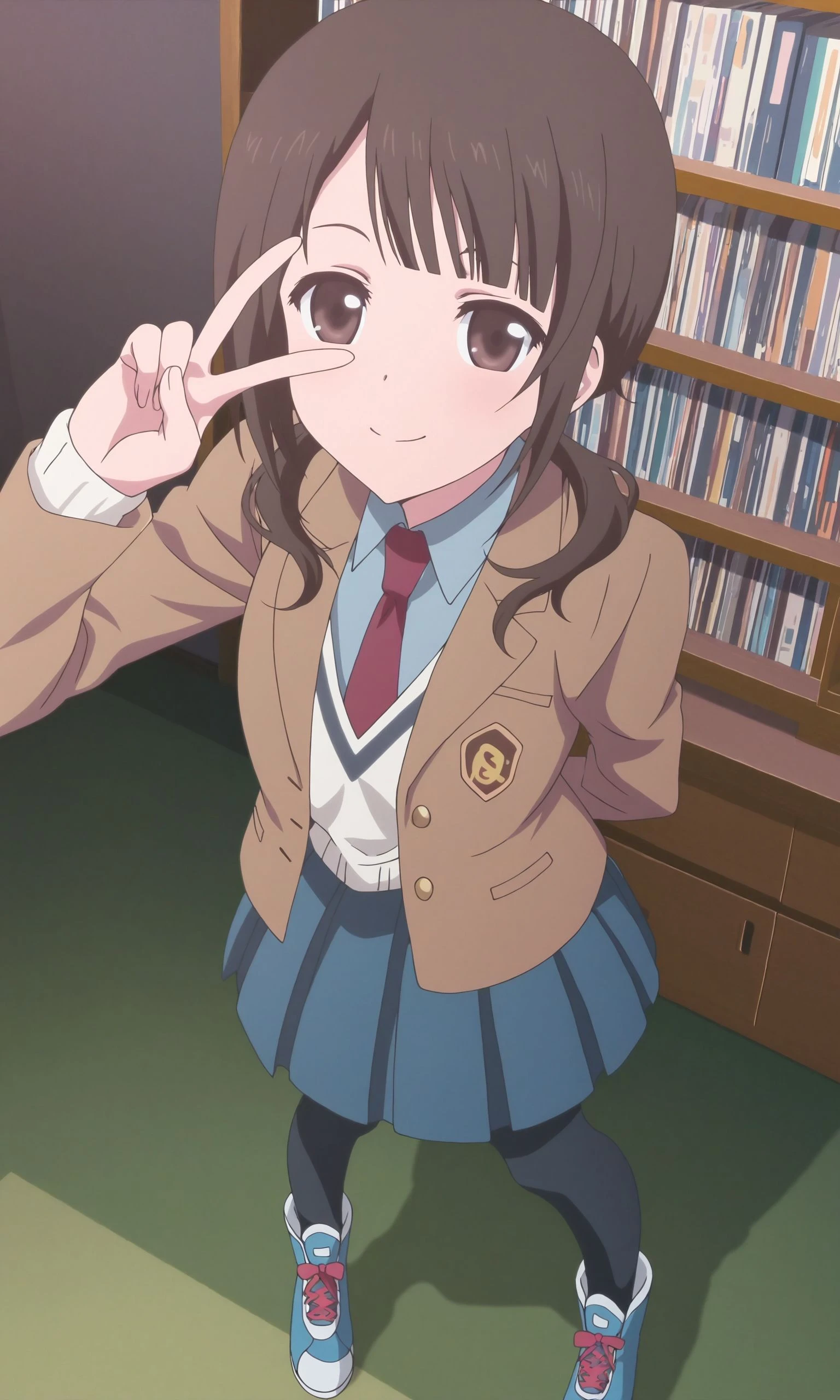 school uniform, necktie, blue skirt,brown jacket, blazer,pleated skirt,long_sleeves,open clothes, open shirt,black pantyhose,blue footwear,sneakers