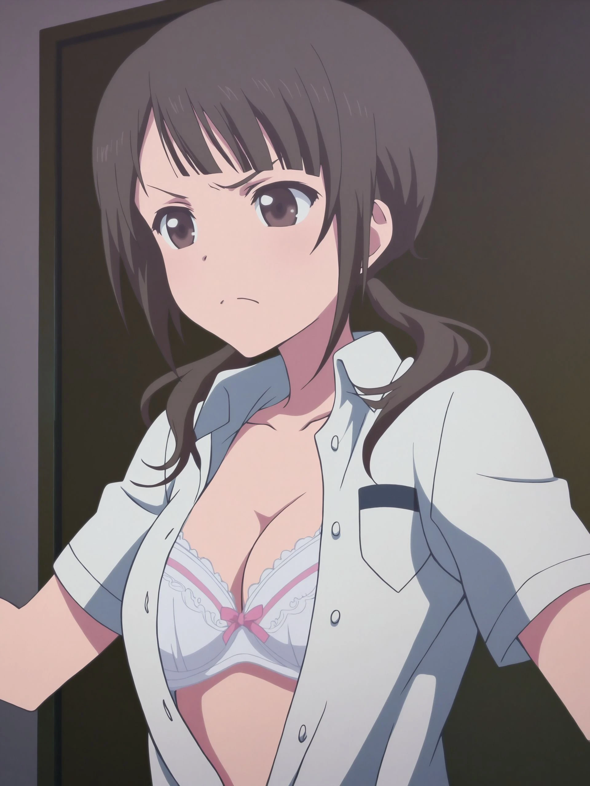 breasts,undressing, bra,white bra, underwear, cleavage, shirt,half_open clothes, open shirt, lingerie, school uniform