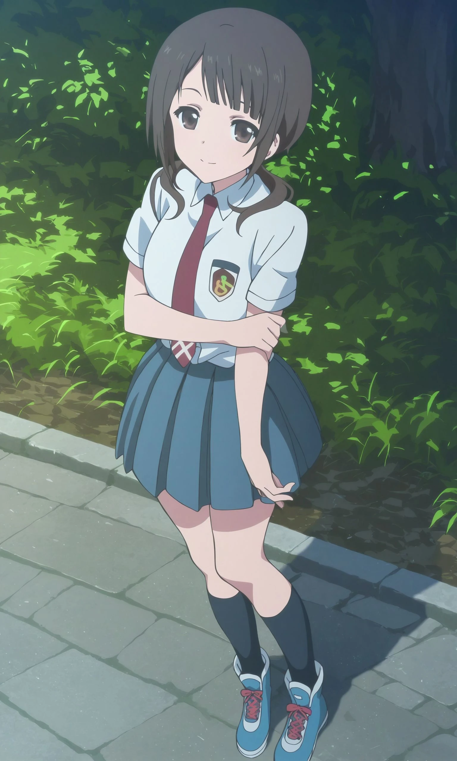 school uniform,necktie, skirt,shirt,white shirt,pleated skirt, red necktie, short sleeves,kneehighs,black socks,blue footwear,sneakers,