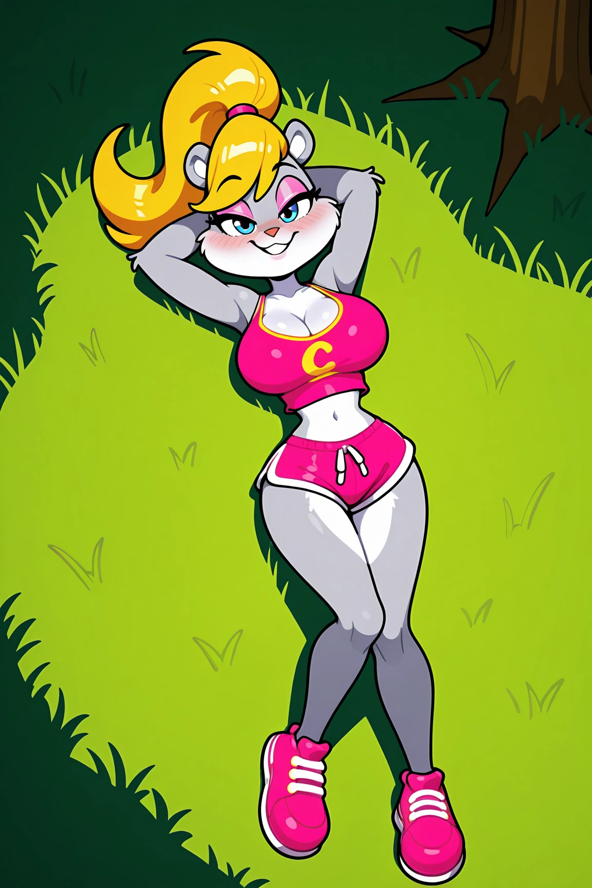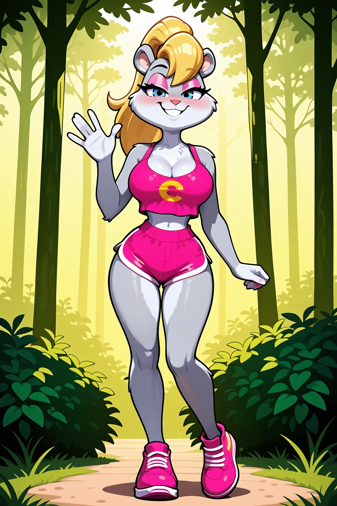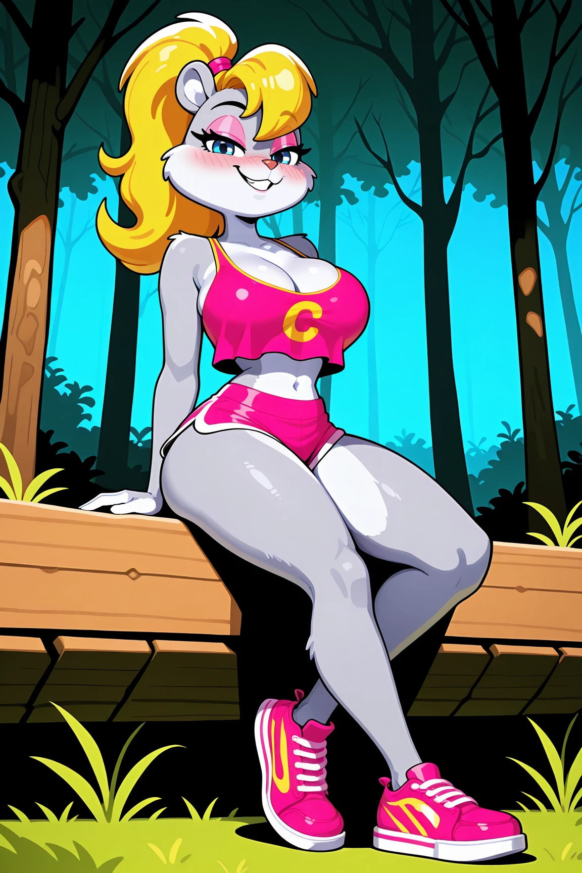 BerriCBFDILXL, anthro furry, furry female, body fur, grey fur, grey body, pink eyeshadow, blue eyes, blonde hair, long ponytail, bangs, animal ears, large breasts, cleavage, pink crop top, pink shorts, short shorts, pink shoes