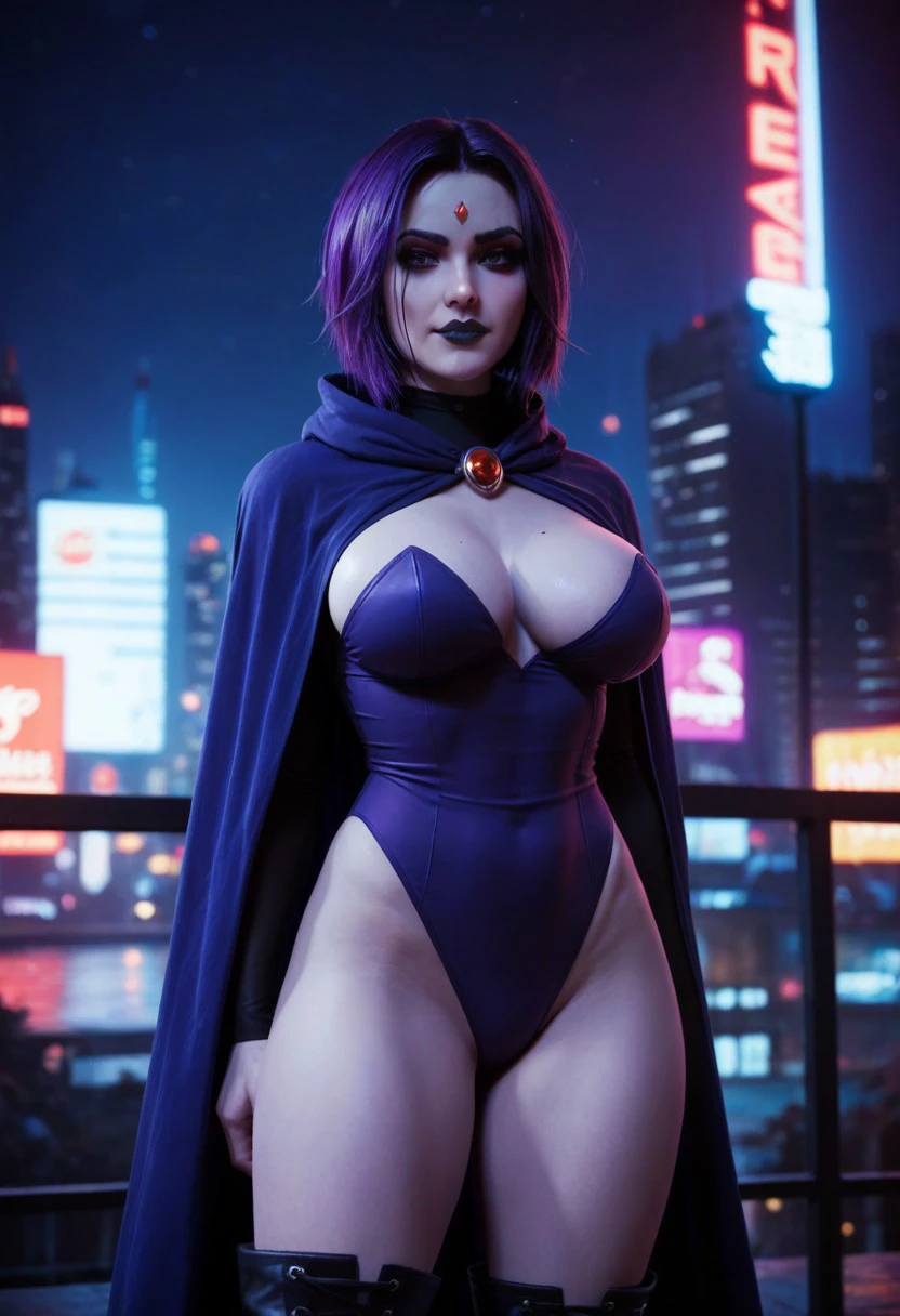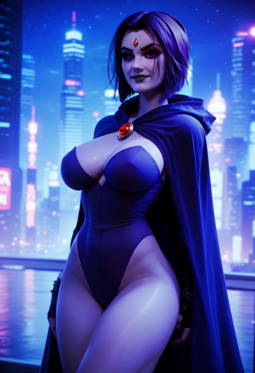 (red forehead jewel:1.3), straight short hair, purple hair, detailed hair, purple eyes, expressive, goth makeup, gray skin tone, textured skin, hint of abs