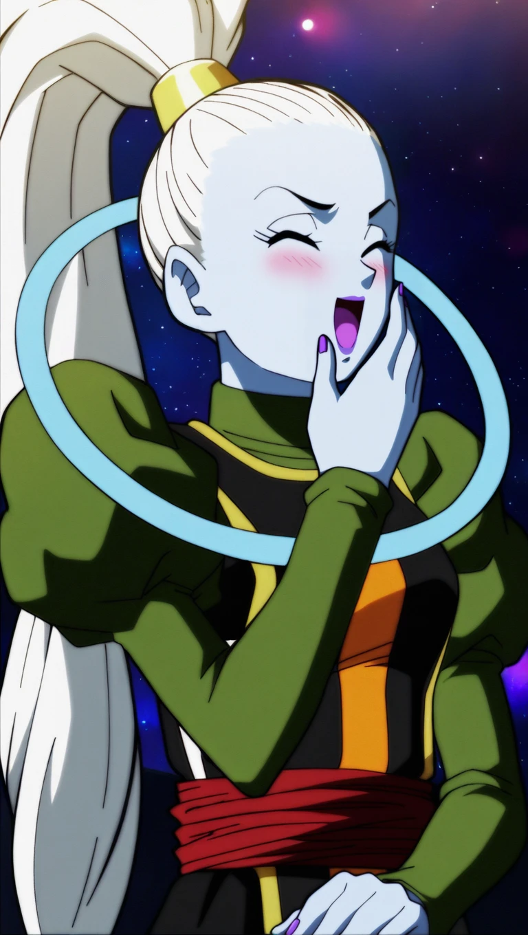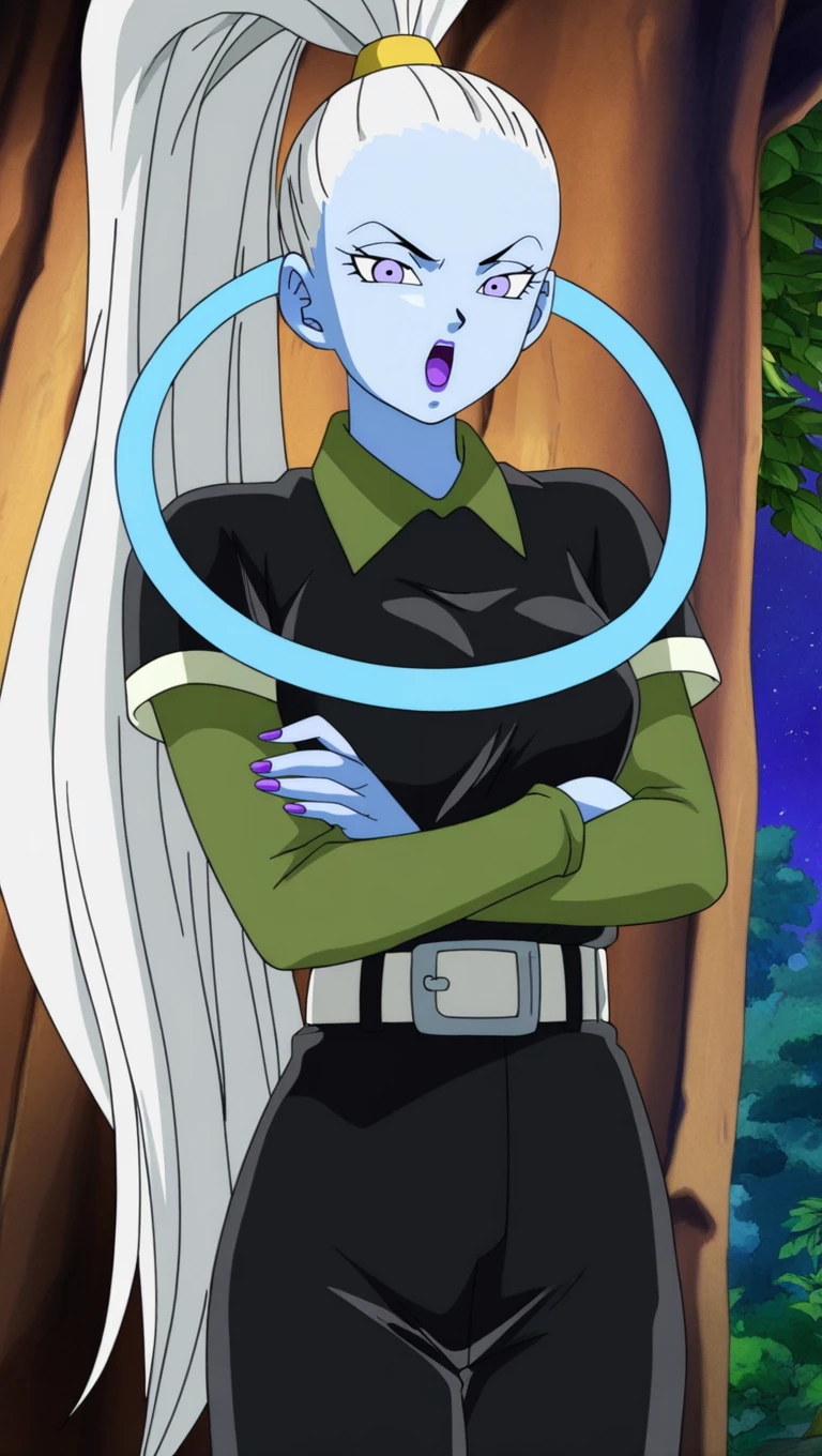 ump1r3 outfit, long ponytail, gold hairband, black shirt, white belt, black pants, green socks, white footwear, black heels, green undershirt, blue halo,