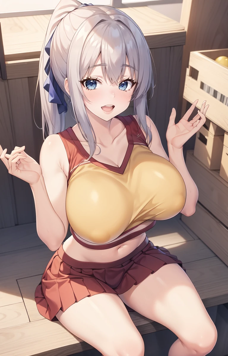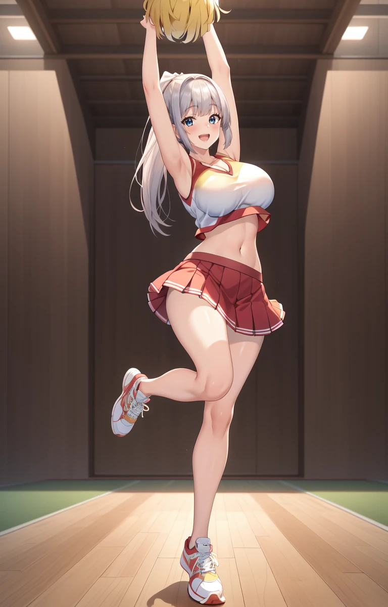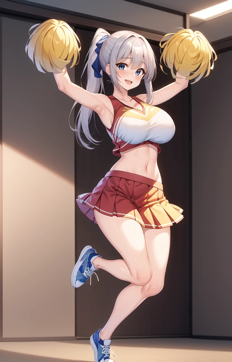 Tag you should use that help getting the outfit: Chieri Shizukuishi, silver hair, gradient hair, blue eyes, very long ponytail, red skirt, pleated skirt, yellow pom pom (clothes),