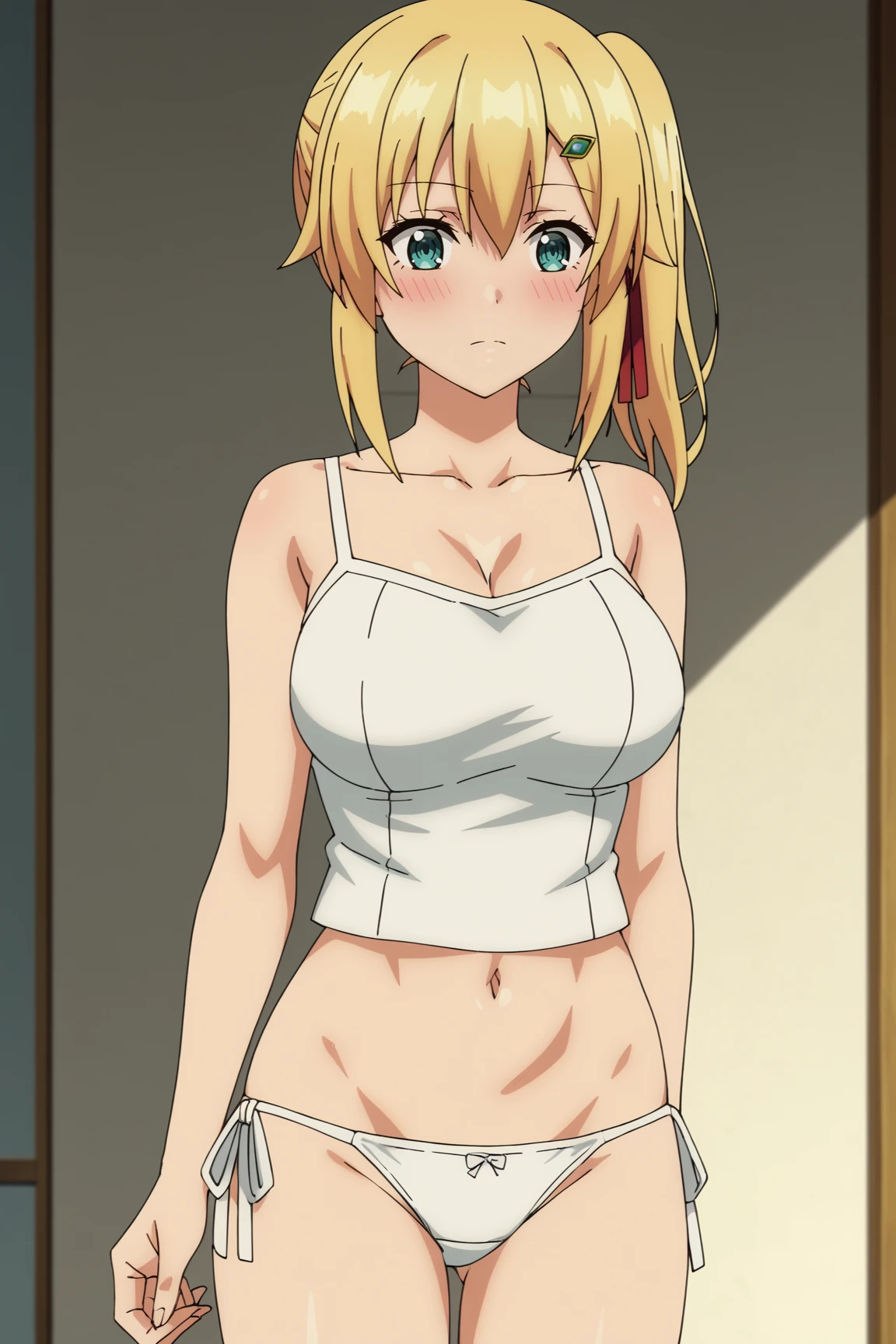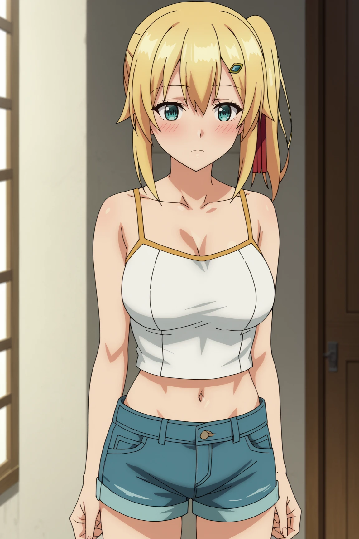 1girl, emma brightness, ore dake haireru kakushi dungeon, blonde hair, blue eyes, short hair, hair ribbon, side ponytail, hairclip, large breasts,outfit 1 (her common clothes):