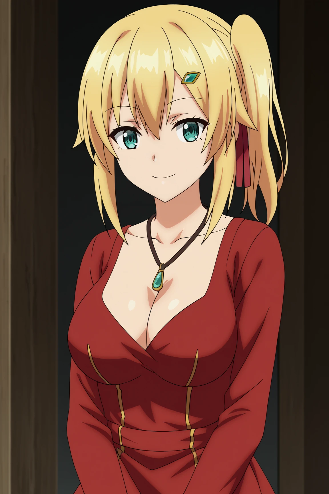 emmared, red dress, long sleeves, cleavage, pendant,