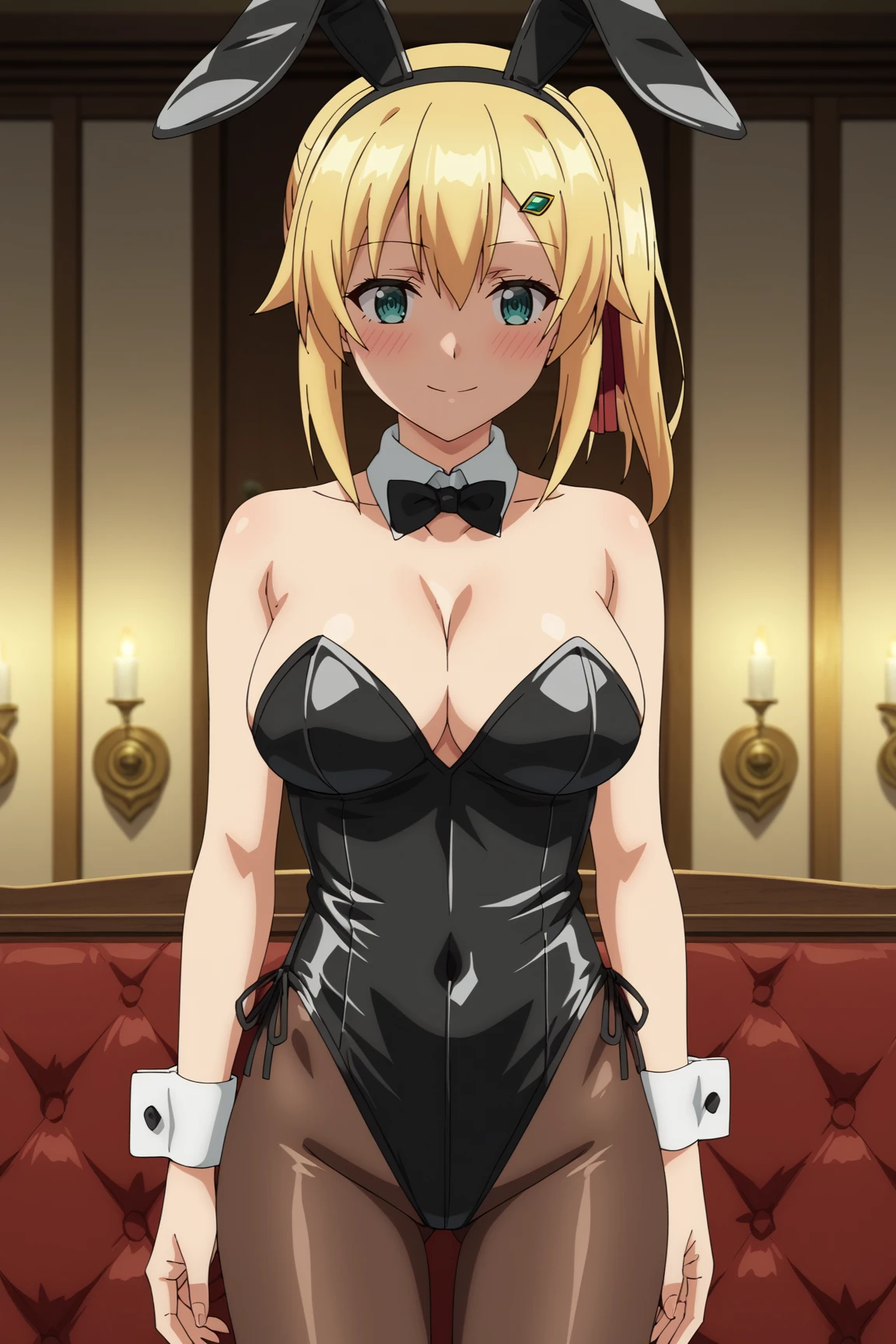 1girl, emma brightness, ore dake haireru kakushi dungeon, blonde hair, blue eyes, hairclip, large breasts, emmadress, white dress, long dress, gloves, black thighhighs, bare shoulders, strapless dress, side slit, cleavage, neck ribbon, braid, Quality tags for Pony Diffusion v6 and his variants: