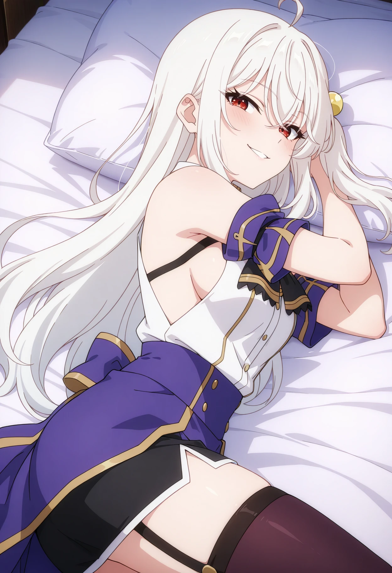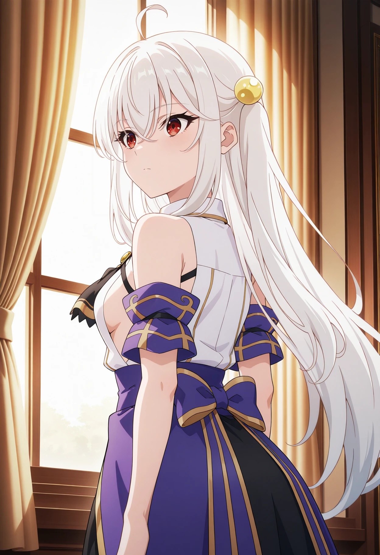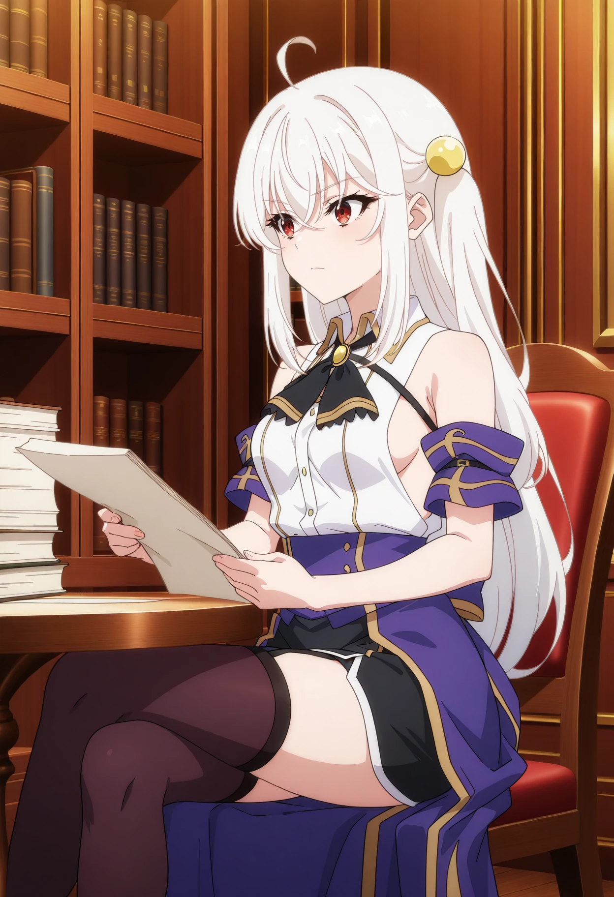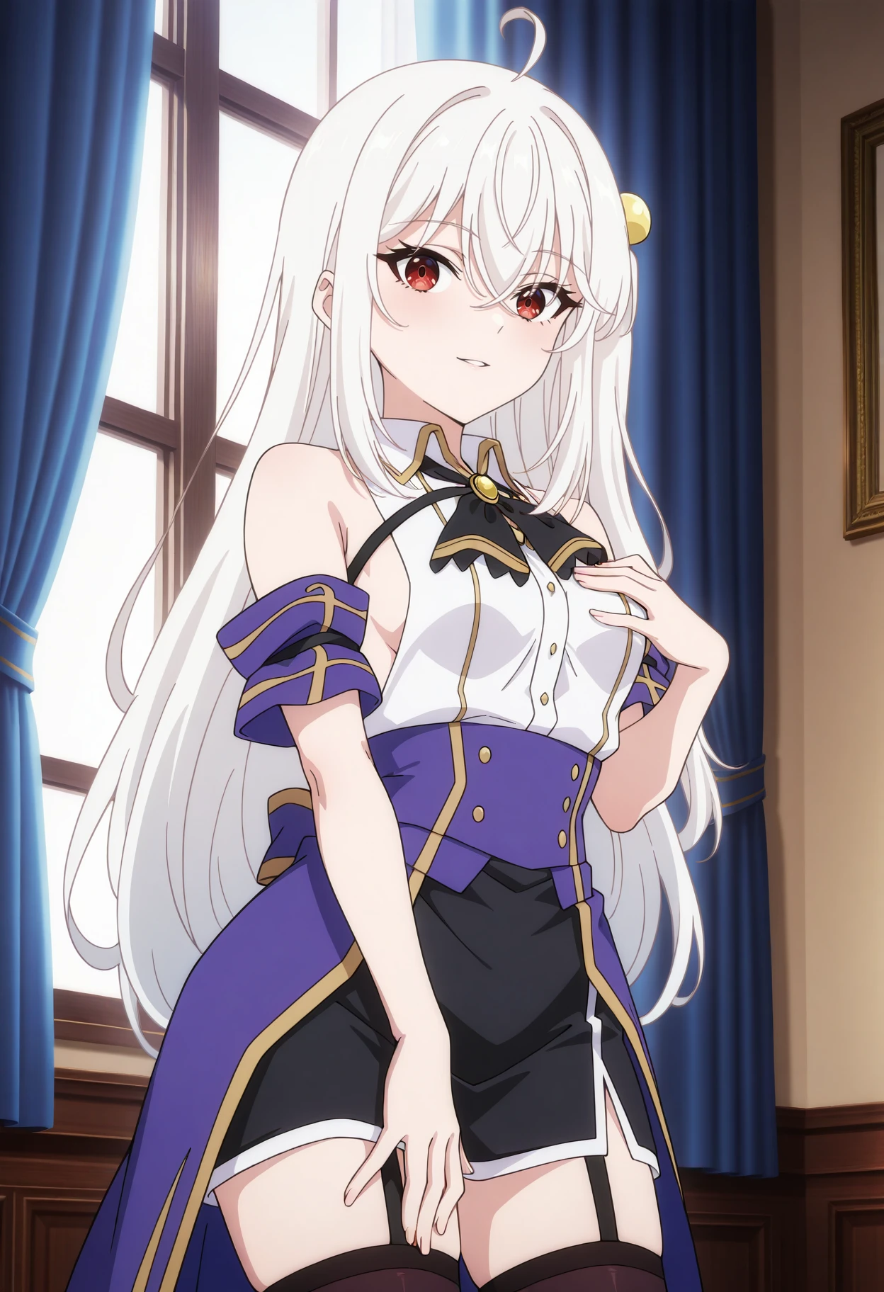 Base: ninym_r, 1girl, anime coloring, long hair, white hair, hair between eyes, hair bobbles, one side up, sidelocks, ahoge, crossed bangs, red eyes, white sleeveless shirt, detached short sleeves, black brooch ascot, chest strap, purple waist cape, black mini skirt, garter straps, black thighhighs, white gloves, medium breasts