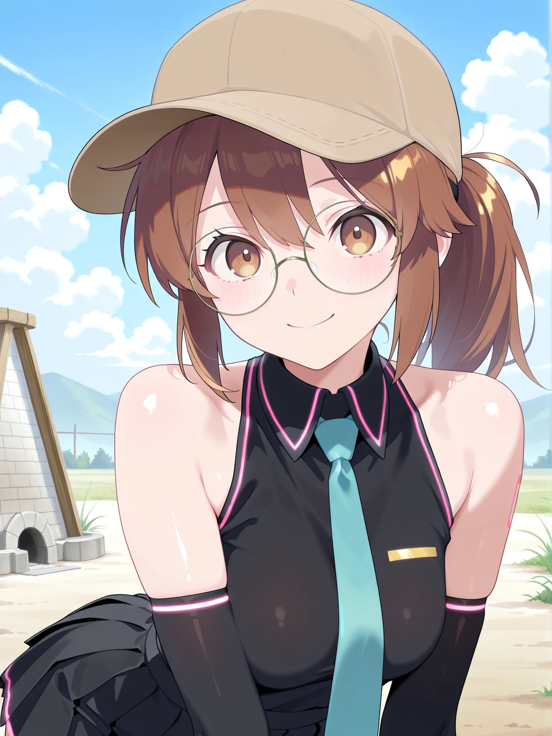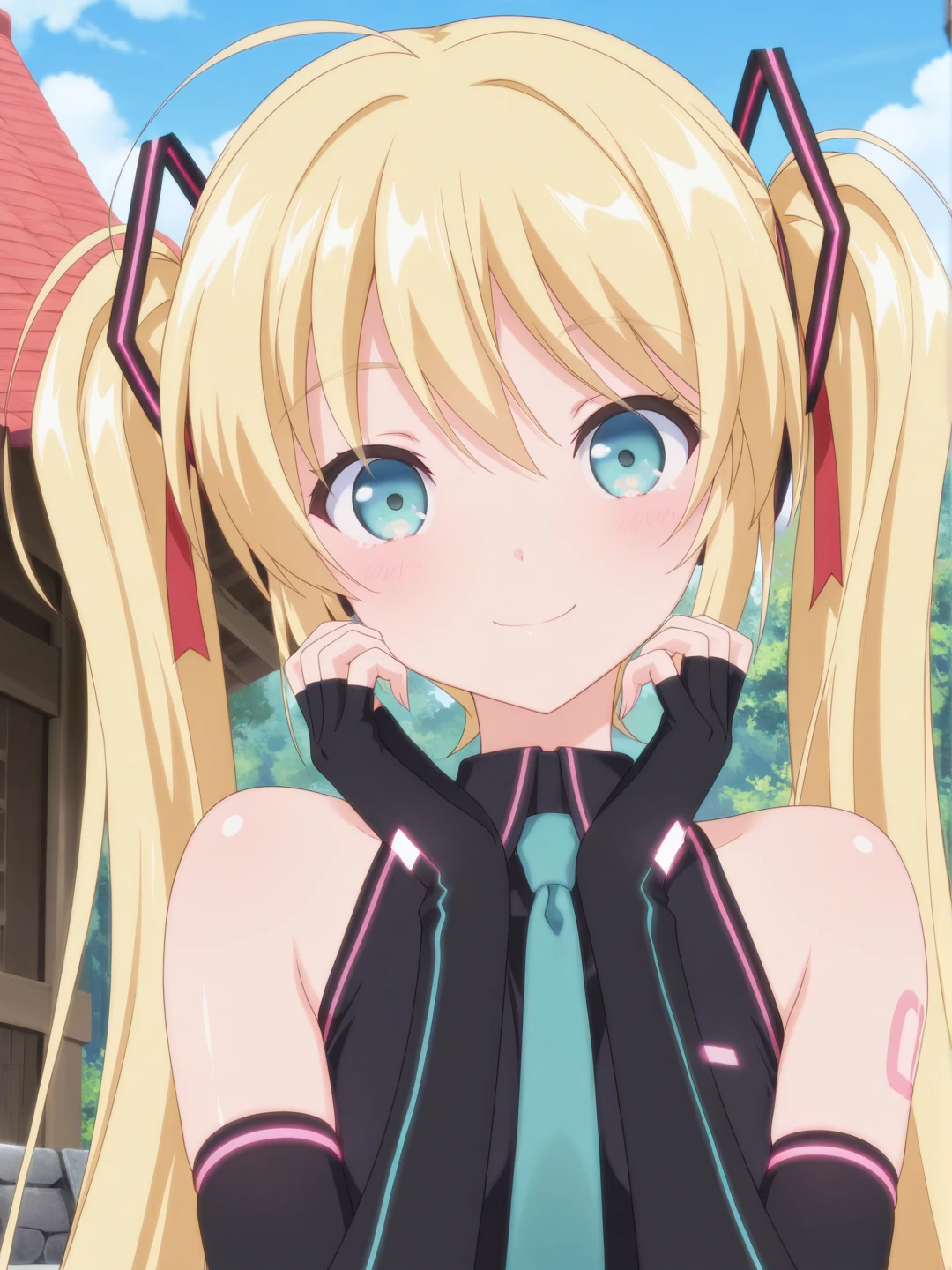 bare shoulders,black dress,aqua necktie,detached sleeves,elbow gloves,fingerless gloves,black gloves,zettai ryouiki,black thighhighs,thigh boots