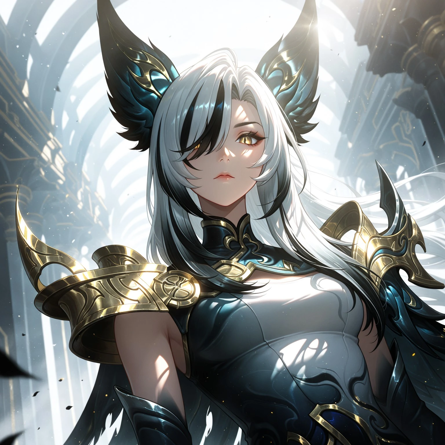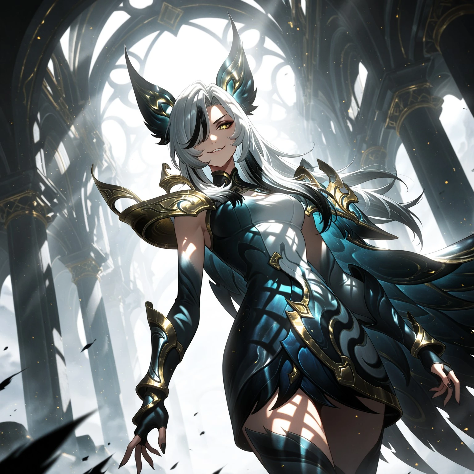 CGHxayah, long hair, white hair, black highlights, hair over one eye, yellow eyes, multicolored dress, elbow gloves, cloak, thighhighs,