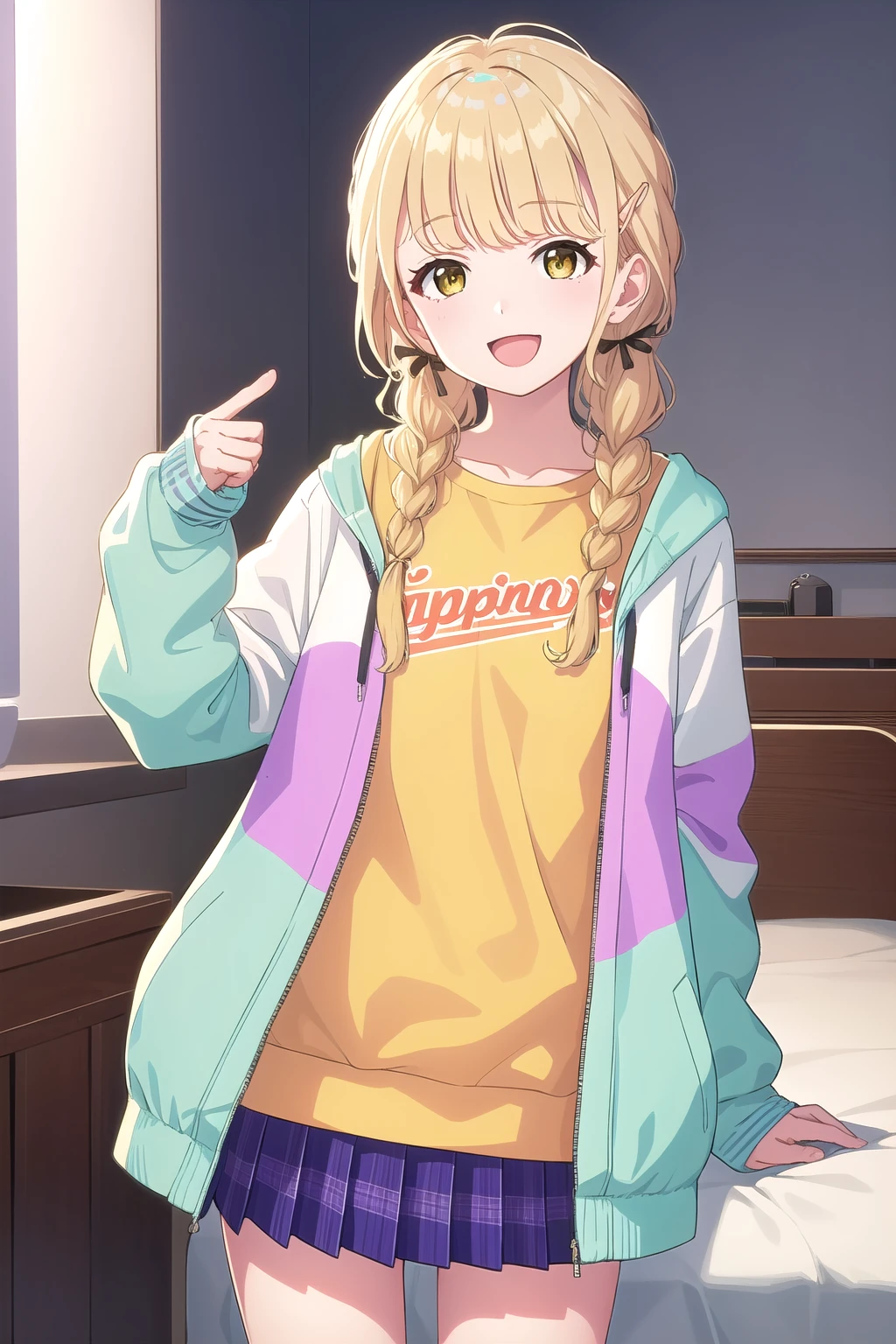 aqua hoodie, multicolored cardigan, off-shoulder cardigan, open cardigan, yellow sweater, print sweater, puffy long sleeves, sleeves past wrists, purple skirt, plaid skirt