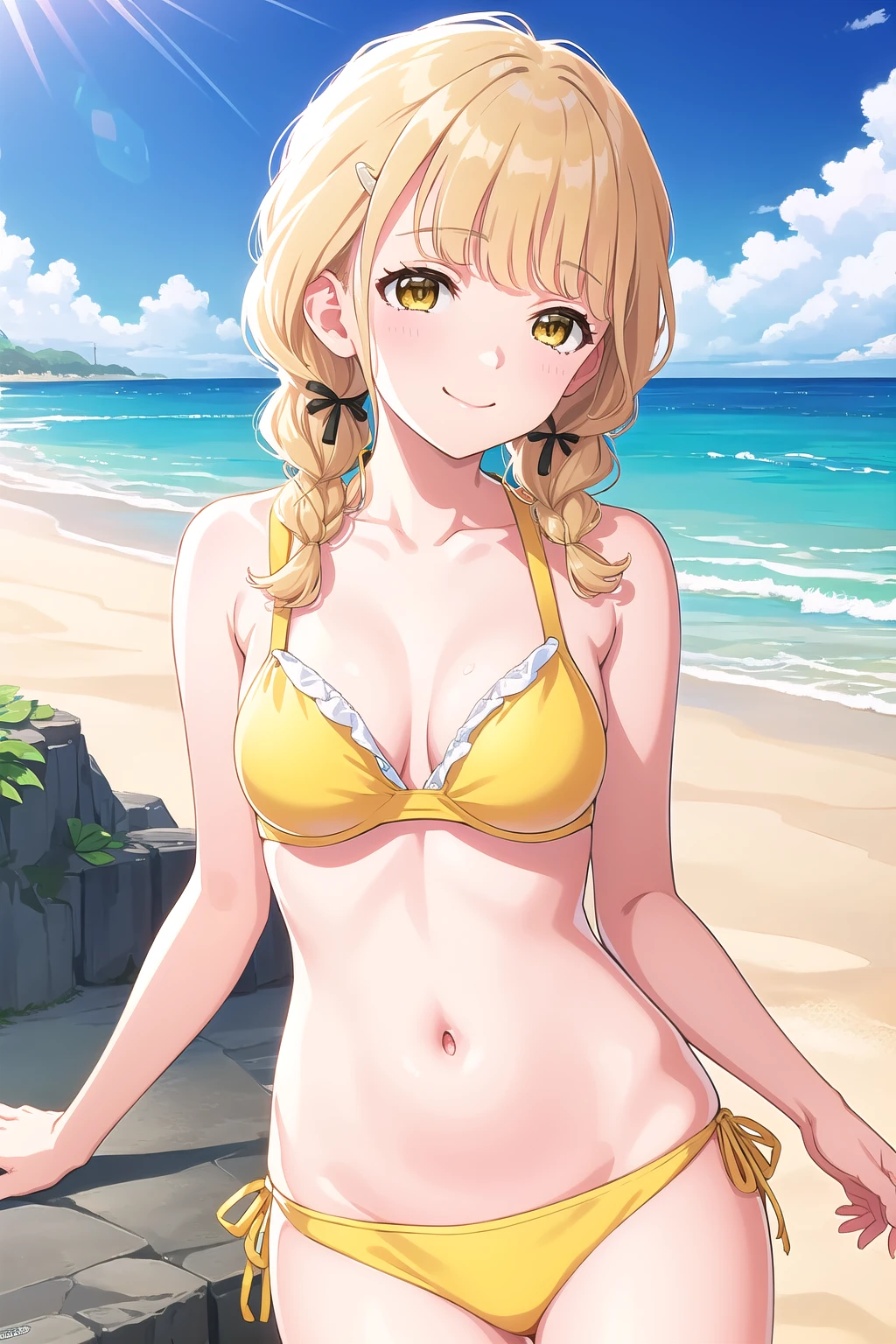 blonde hair, low twin braids, hair ribbon, black ribbon, pearl hairclip, blunt bangs, hair over shoulder, long hair, yellow eyes