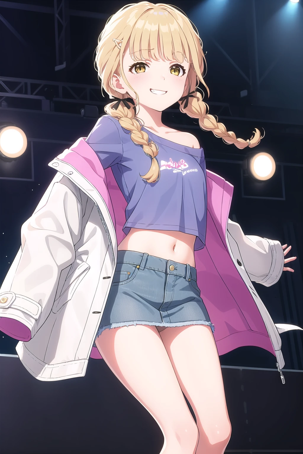 white coat, off-shoulder coat, coat partially removed, open coat, sleeves past wrists, blue shirt, cropped shirt, crop top, short sleeves, grey skirt, denim skirt, miniskirt