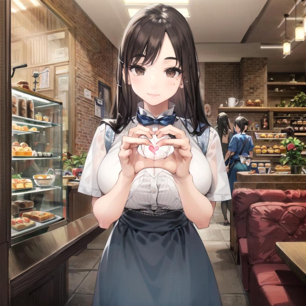 kouhai-chan, 1girl, brown hair, brown eyes, mole on cheek, long hair mole under eye, large breasts, black hair, bangs