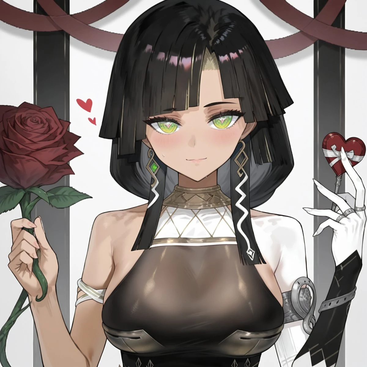 Sara3, 1girl, long hair, breasts, looking at viewer, bangs, large breasts, black hair, jewelry, gloves, very long hair, green eyes, earrings, elbow gloves, white gloves, dark skin, blunt bangs, black footwear, dark-skinned female, armlet, low ponytail, single glove, snake, asymmetrical gloves, single elbow glove, single sleeve, uneven gloves, single detached sleeve
