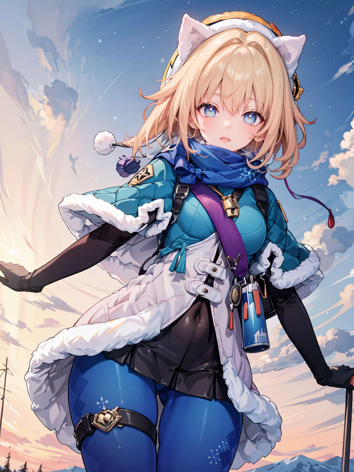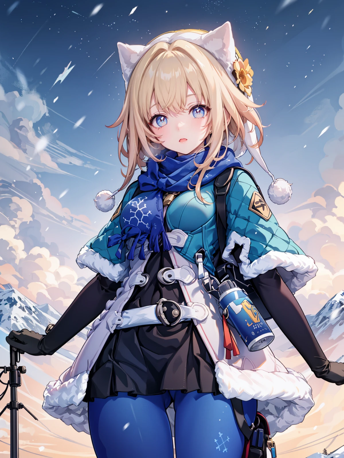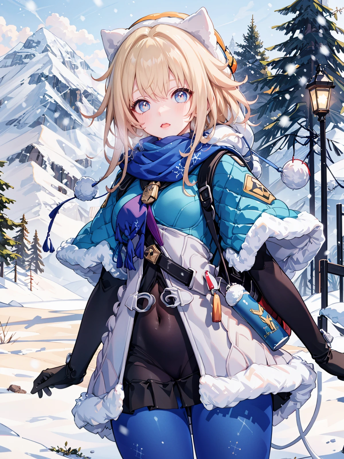 scarf, fur trim, winter clothes, fur-trimmed capelet, print pantyhose, pom pom (clothes), backpack, fur-trimmed boots, elbow gloves