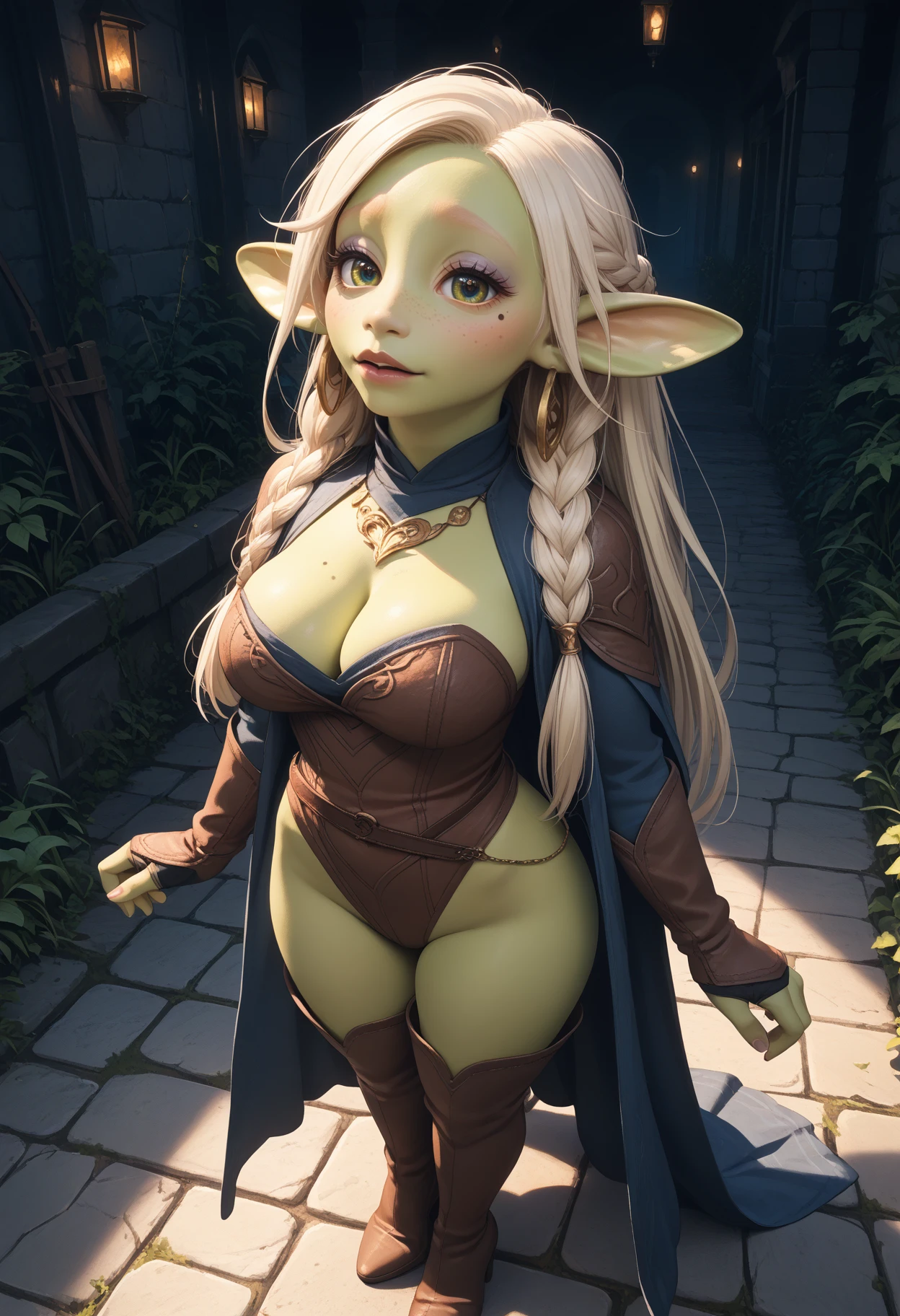 main tags: 1girl, solo, elf, pointy ears, animal ears, colored skin, green skin, lips,