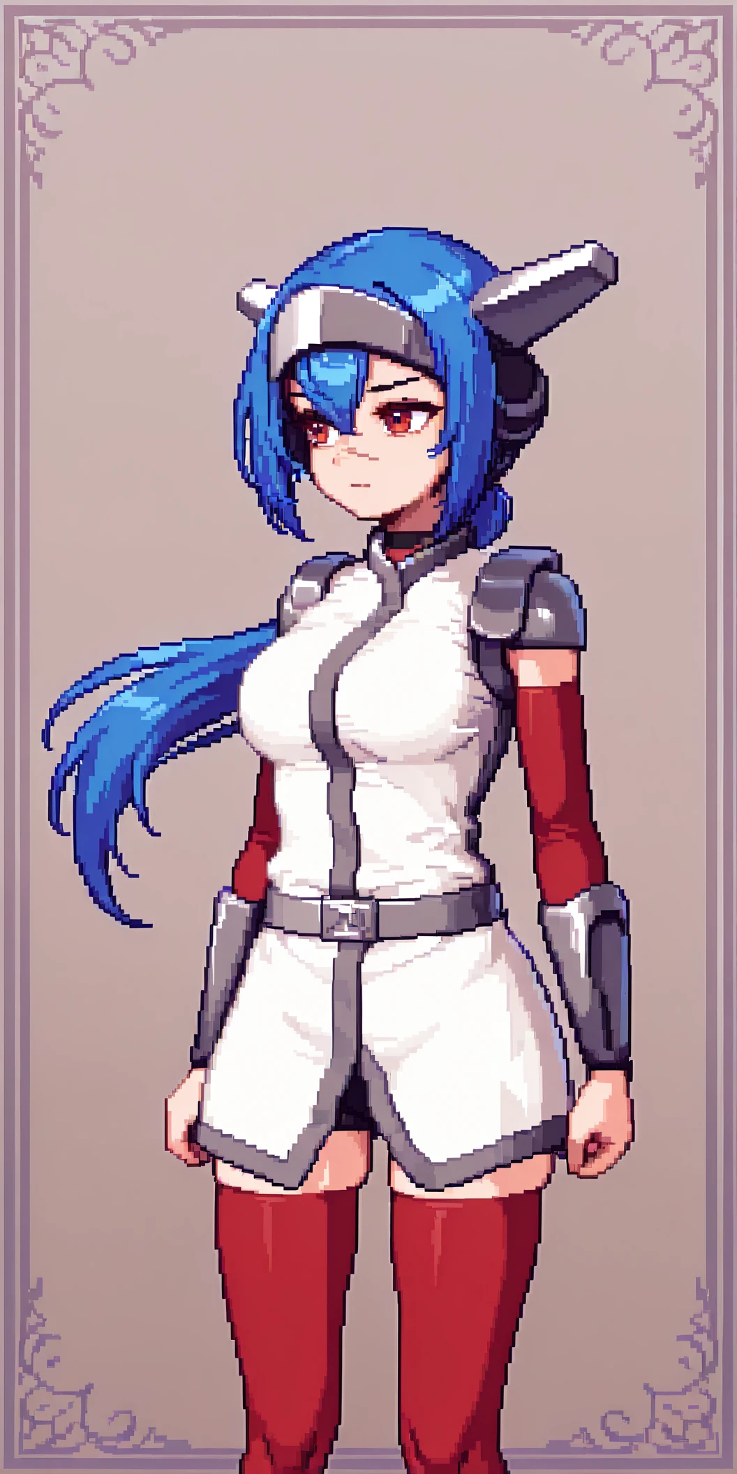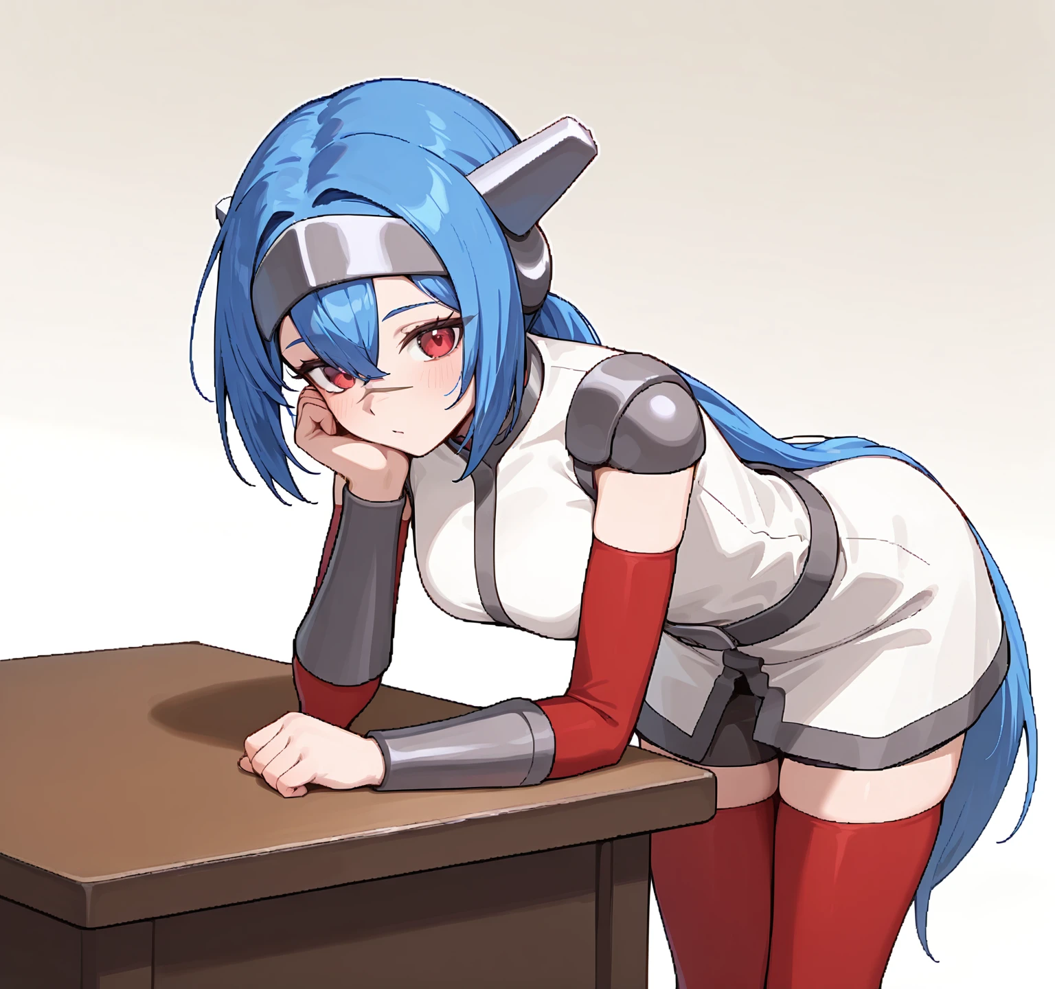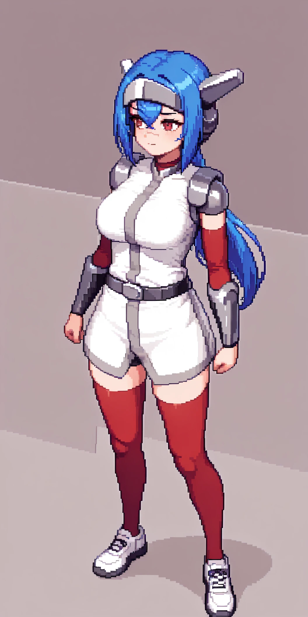 headgear, red thighhighs, white shoes, low ponytail