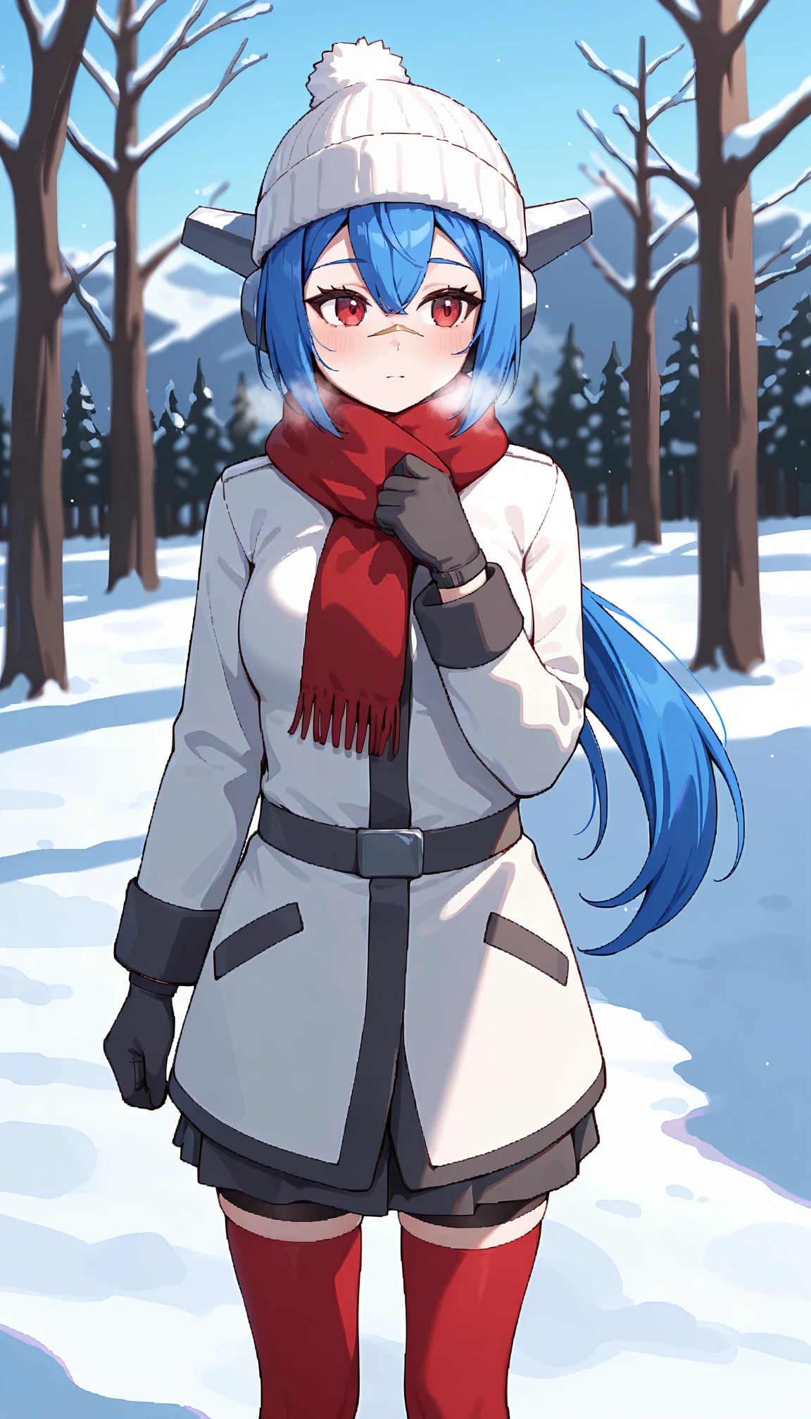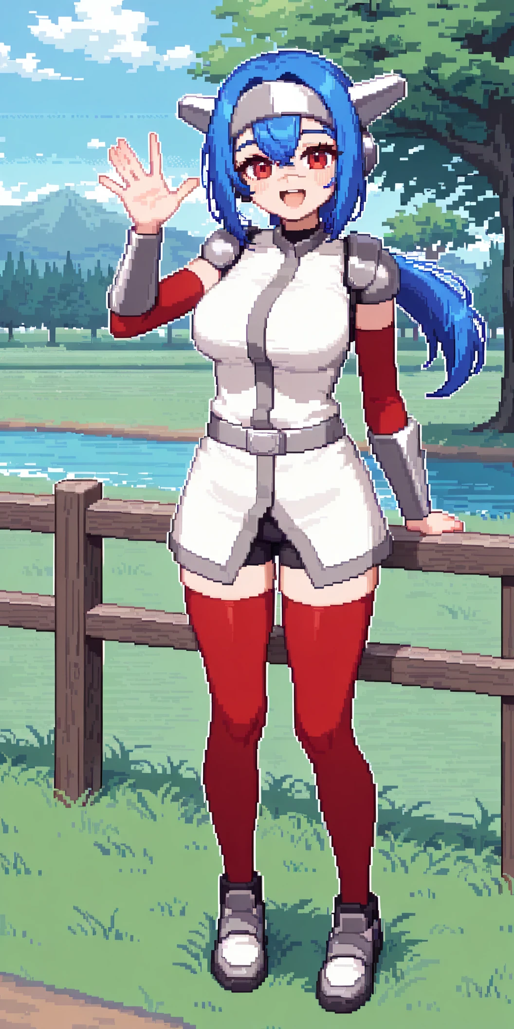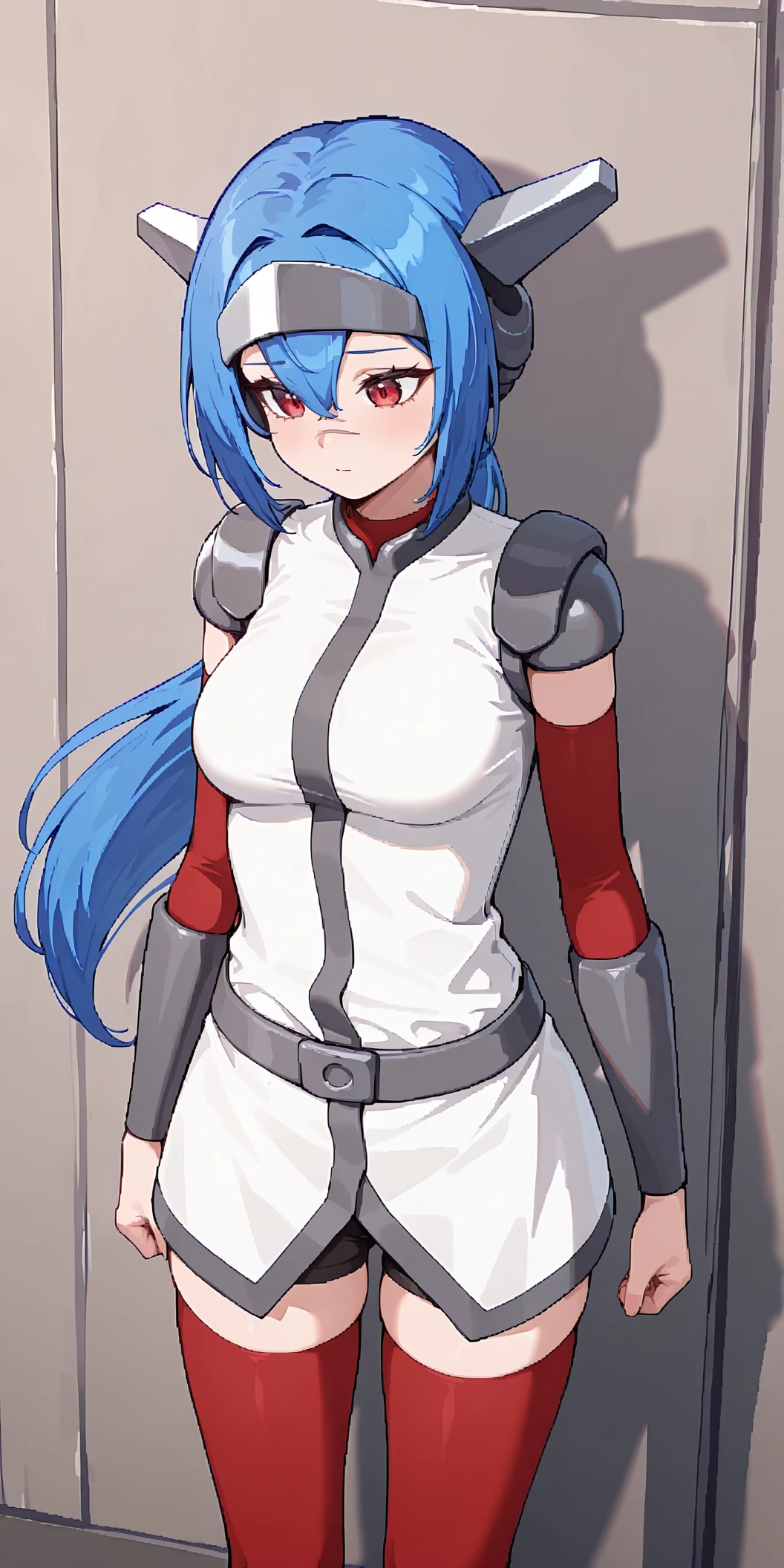 headgear, red thighhighs, white shoes, low ponytail