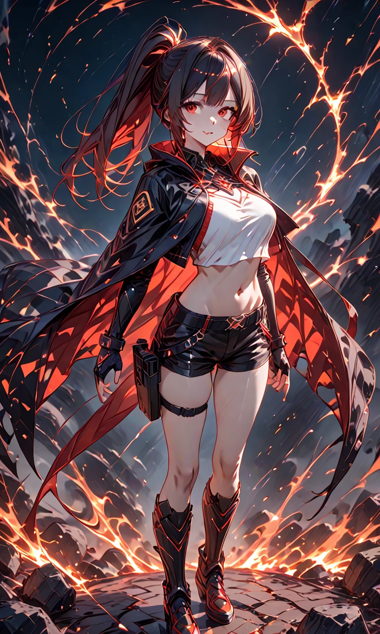 Lisa Tachibana, perfect face, ponytail, black Hair, red inner hair, multicolored red hair, expressive eyes, red eyes, red crystal eyes,