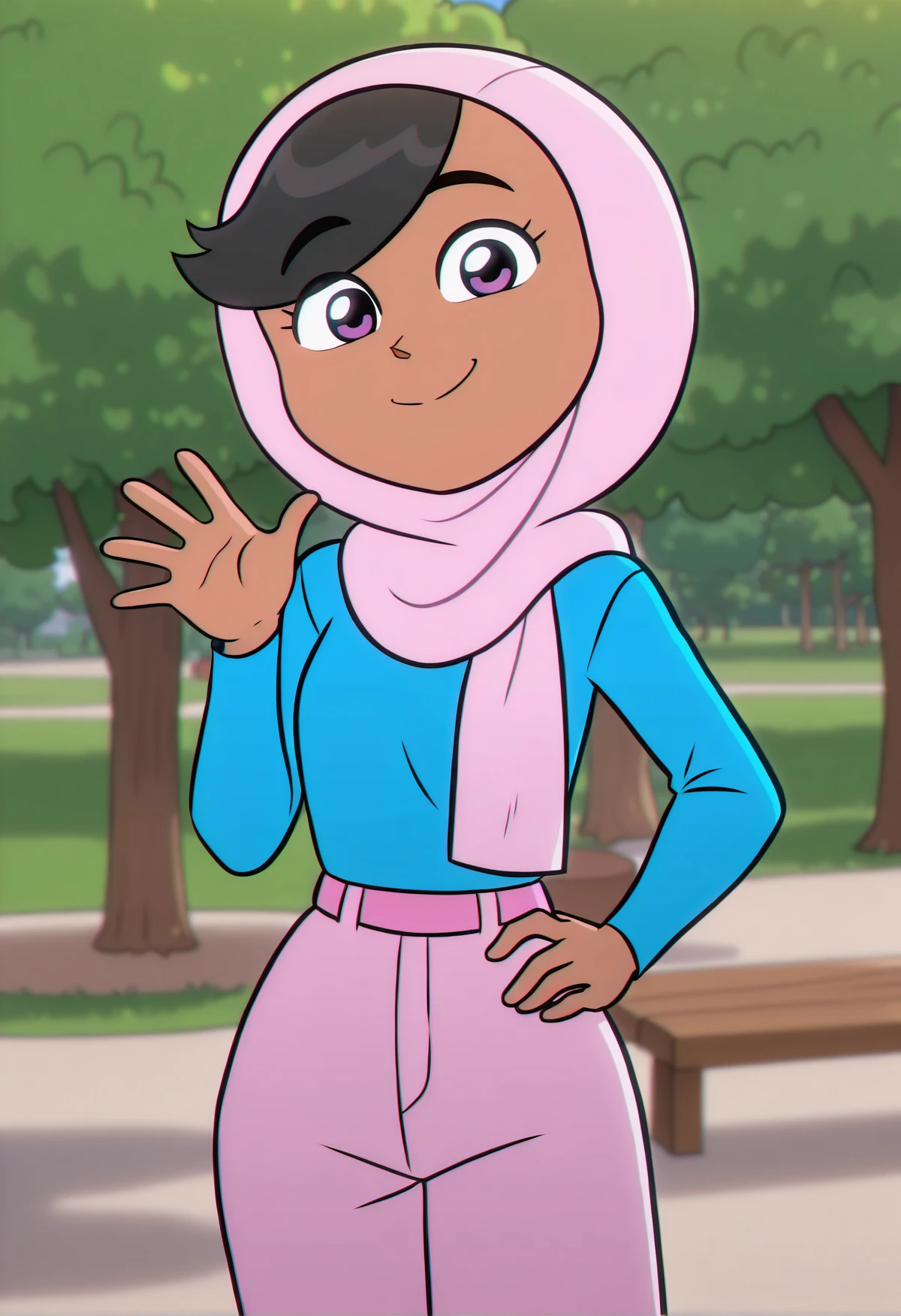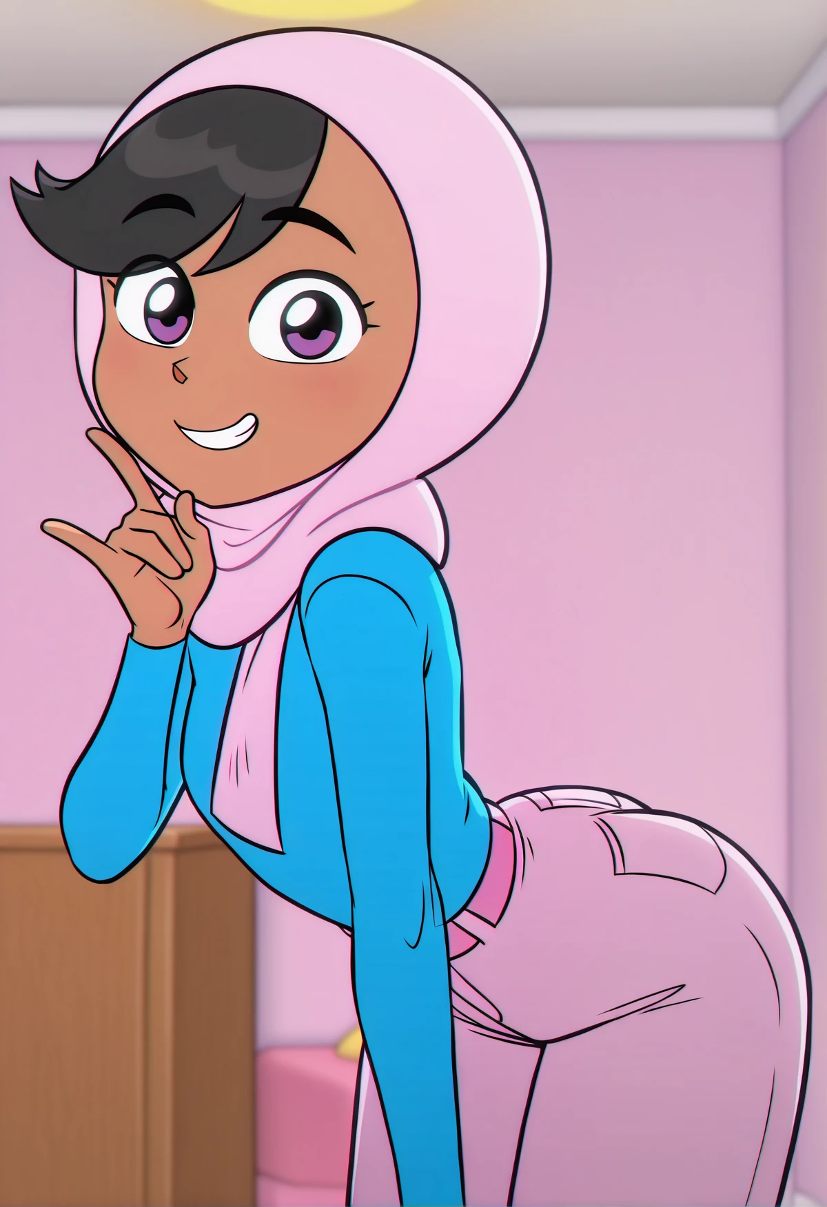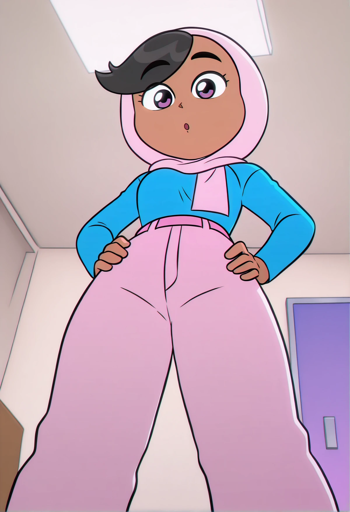 ZariDuolingo, tan skin, purple eyes, black hair, short hair, pink hijab, blue sweater, pink pants, pink shoes