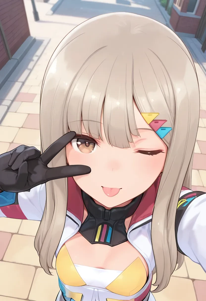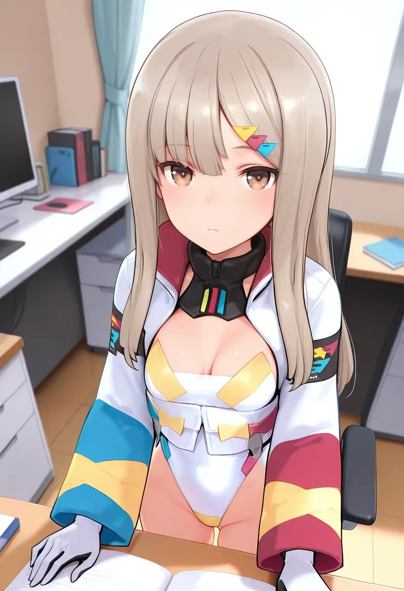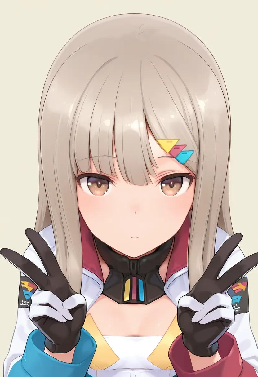 Outfit1 : rakuhana_meru,gray hair,long hair,brown eyes,white leotard,jacket,gloves,asymmetrical color sleeves,