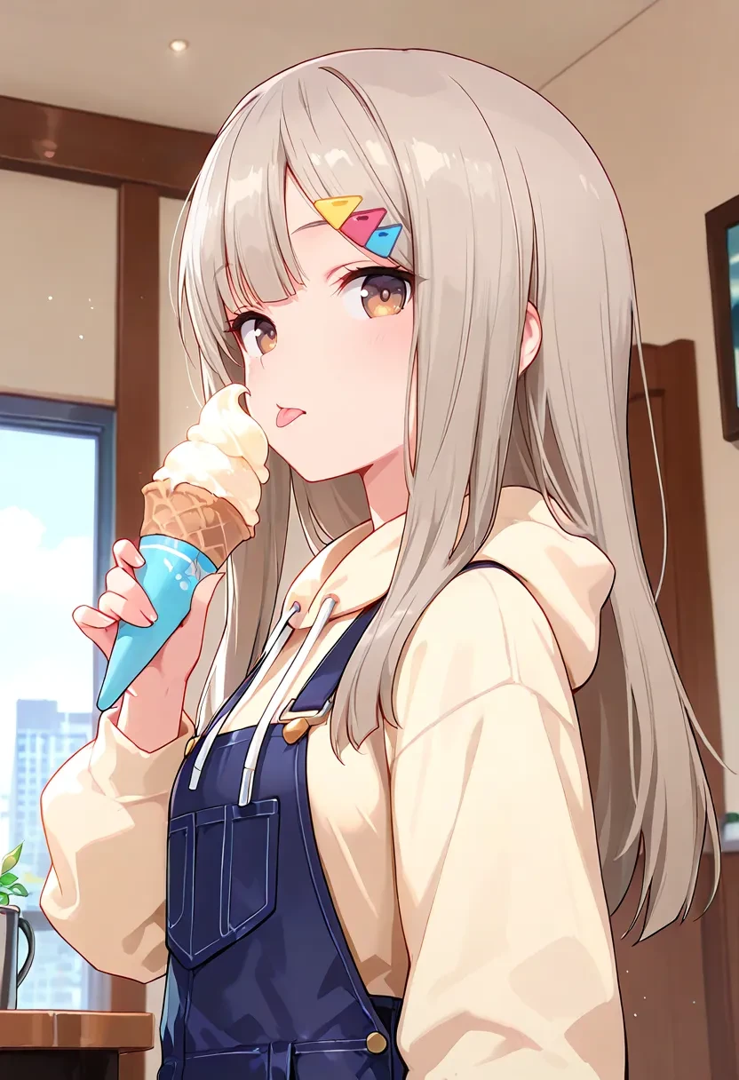 Outfit2 : rakuhana_meru,meru_foodie,blue overalls,shorts,black thighhighs,gray hair,long hair,brown eyes,
